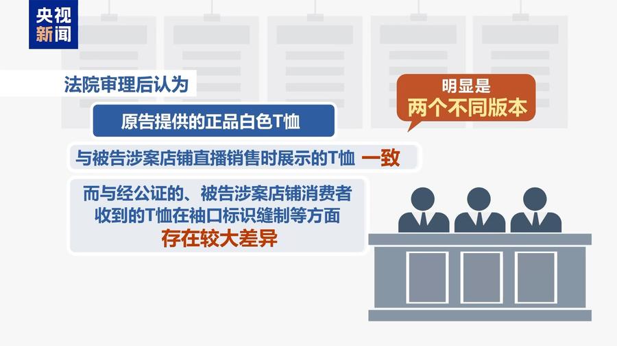 法院审理后认为,原告提供的正品白色T恤与被告涉案店铺直播销售时展示的T恤一致,而与经公证的、被告涉案店铺消费者收到的T恤在袖口标识缝制等方面存在较大差异,明显是两个不同版本。