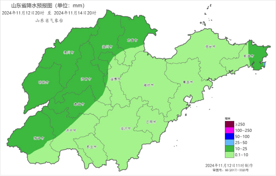 11月12日,记者从山东省气象台了解到,受冷暖空气共同影响,预计12日夜间至14日,山东自西向东有一次较明显降雨天气过程,降水分为两个时段,主要在12日夜间、13日夜间至14日上午。全省过程累积平均降水量5~10毫米,其中,聊城、德州、滨州、东营、济南、泰安、菏泽、济宁和威海8~15毫米局部25毫米以上;其他地区3~8毫米。