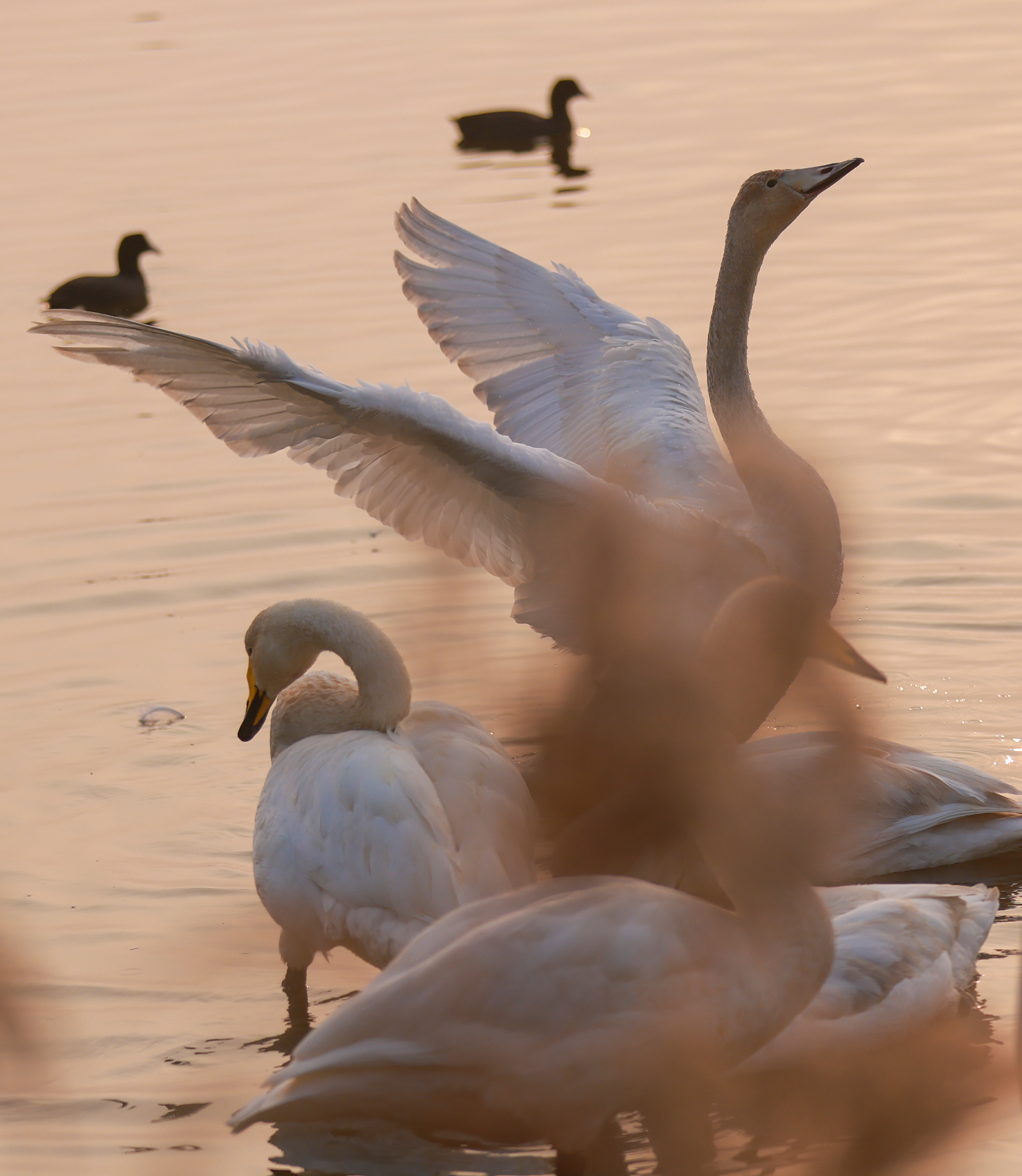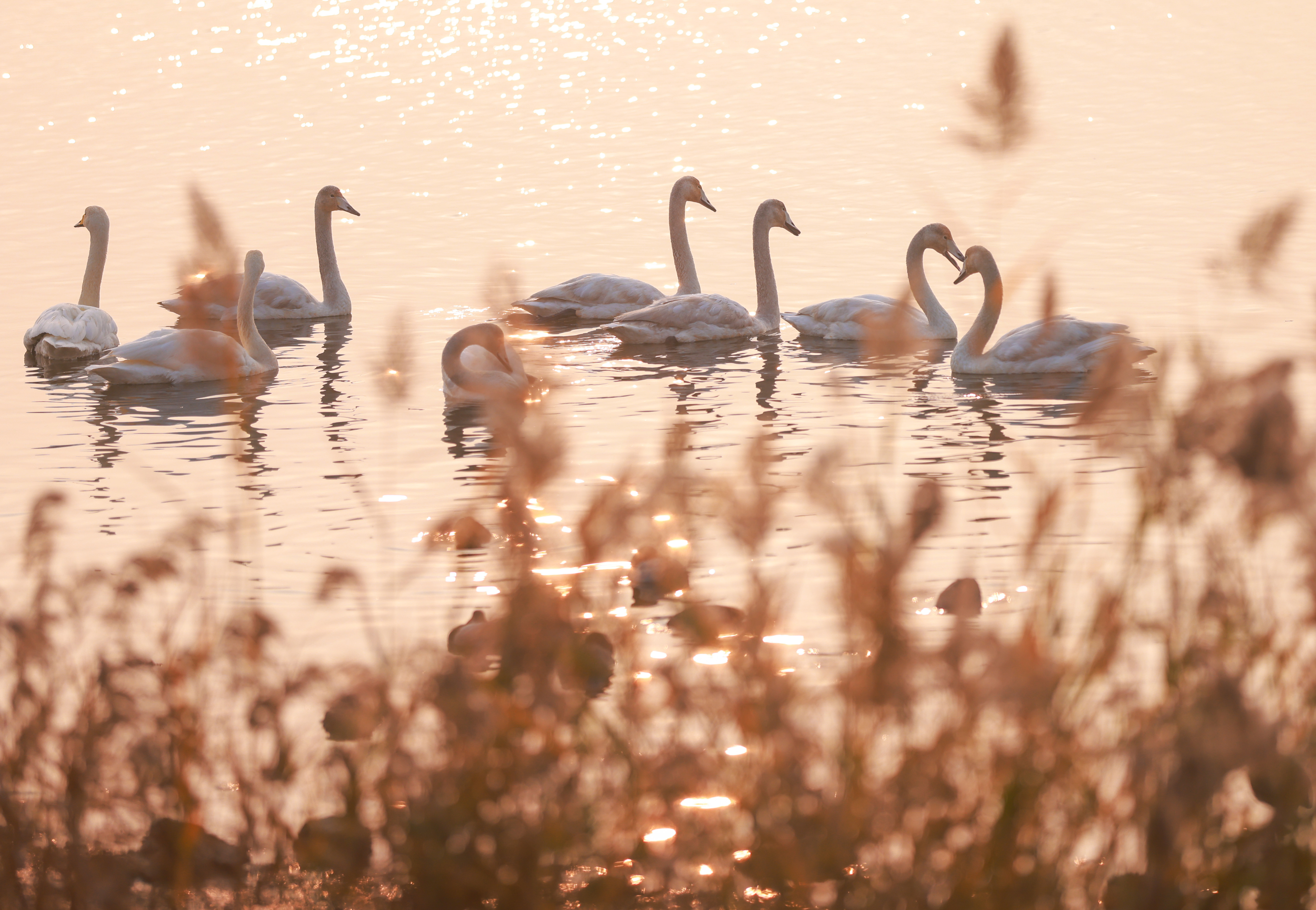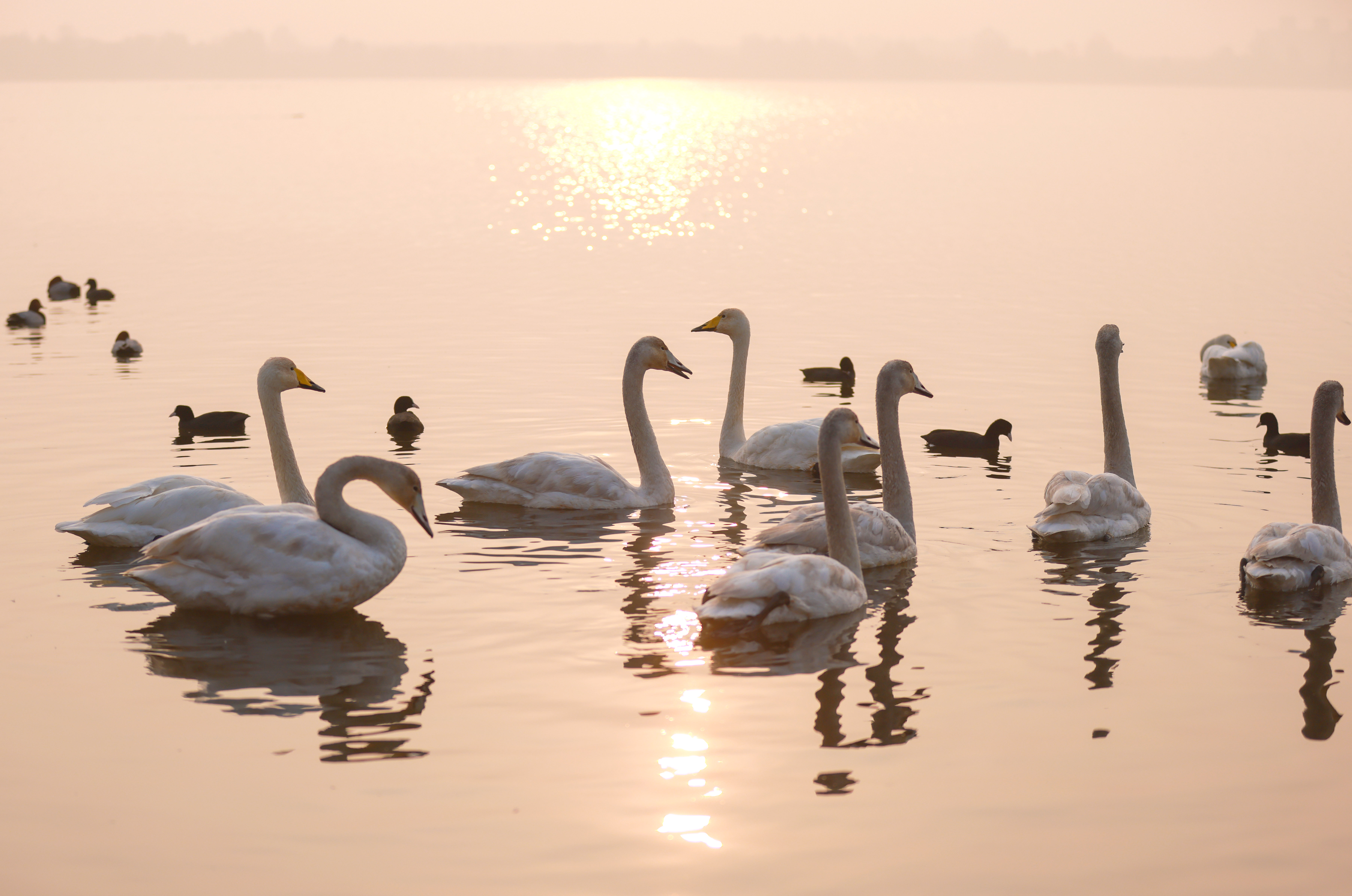 朝阳晨雾中,成群大天鹅在荣成海滨湿地起舞