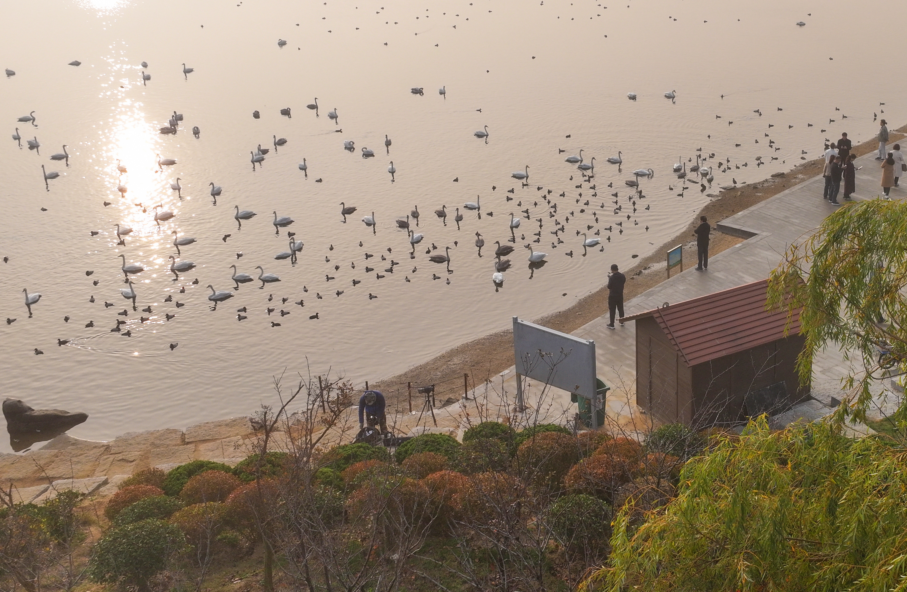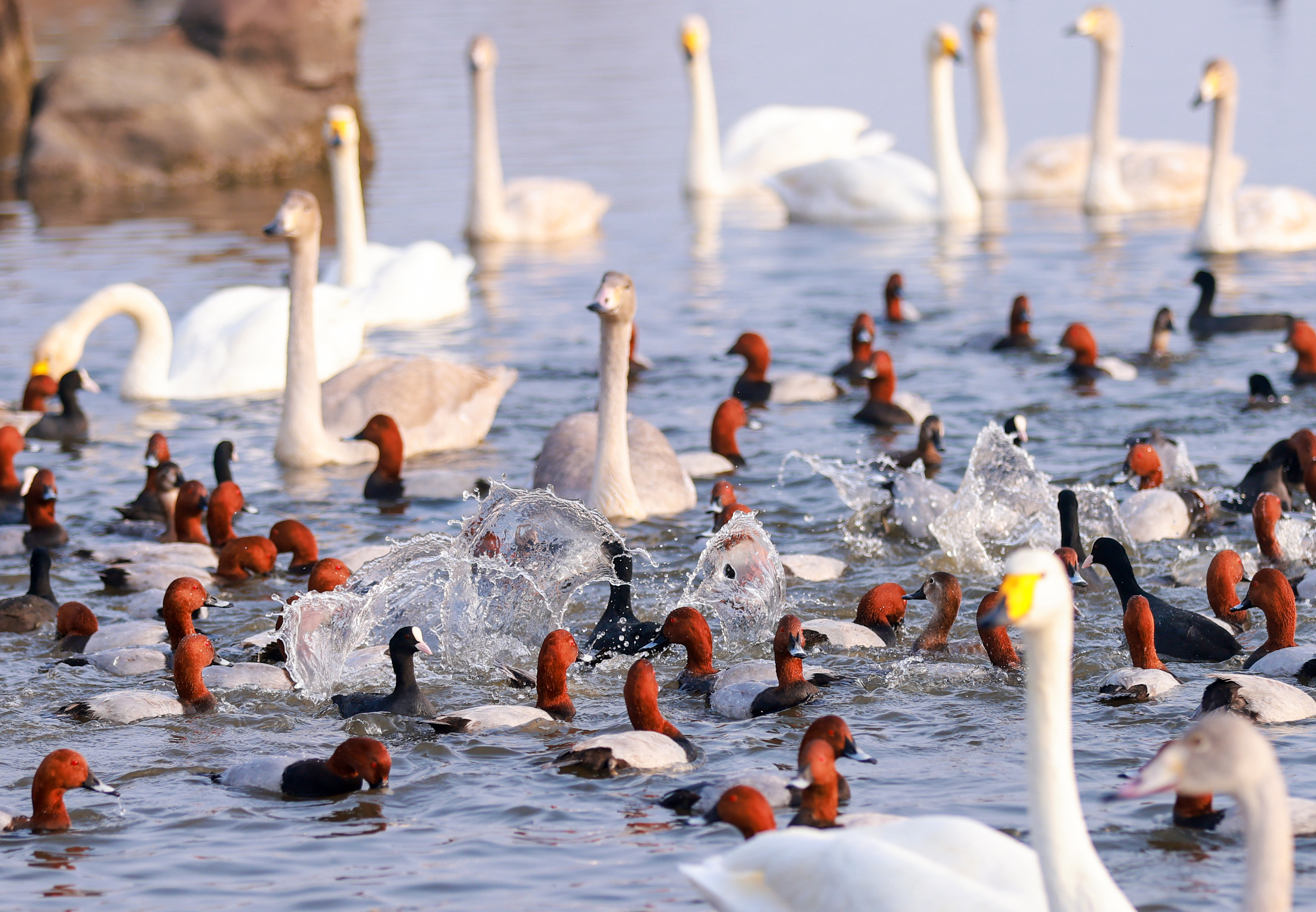 近年来荣成市加大对城市湿地水体和河道的保护与治理,生态功能明显提升。大天鹅、白鹭、沙秋鸭、骨顶鸡等各种珍稀鸟类在此繁衍生息,形成了一个群鸟汇聚的天然王国。