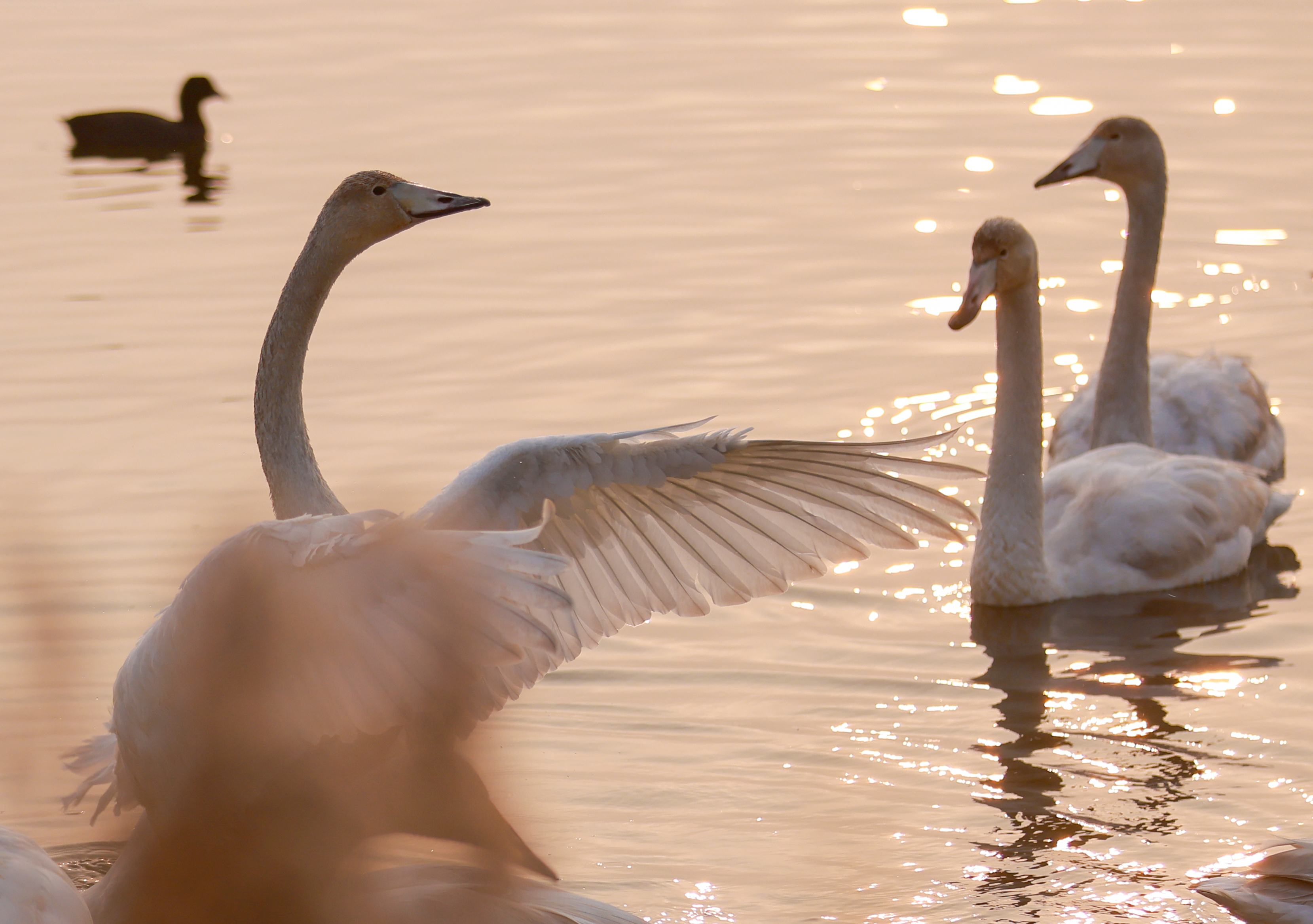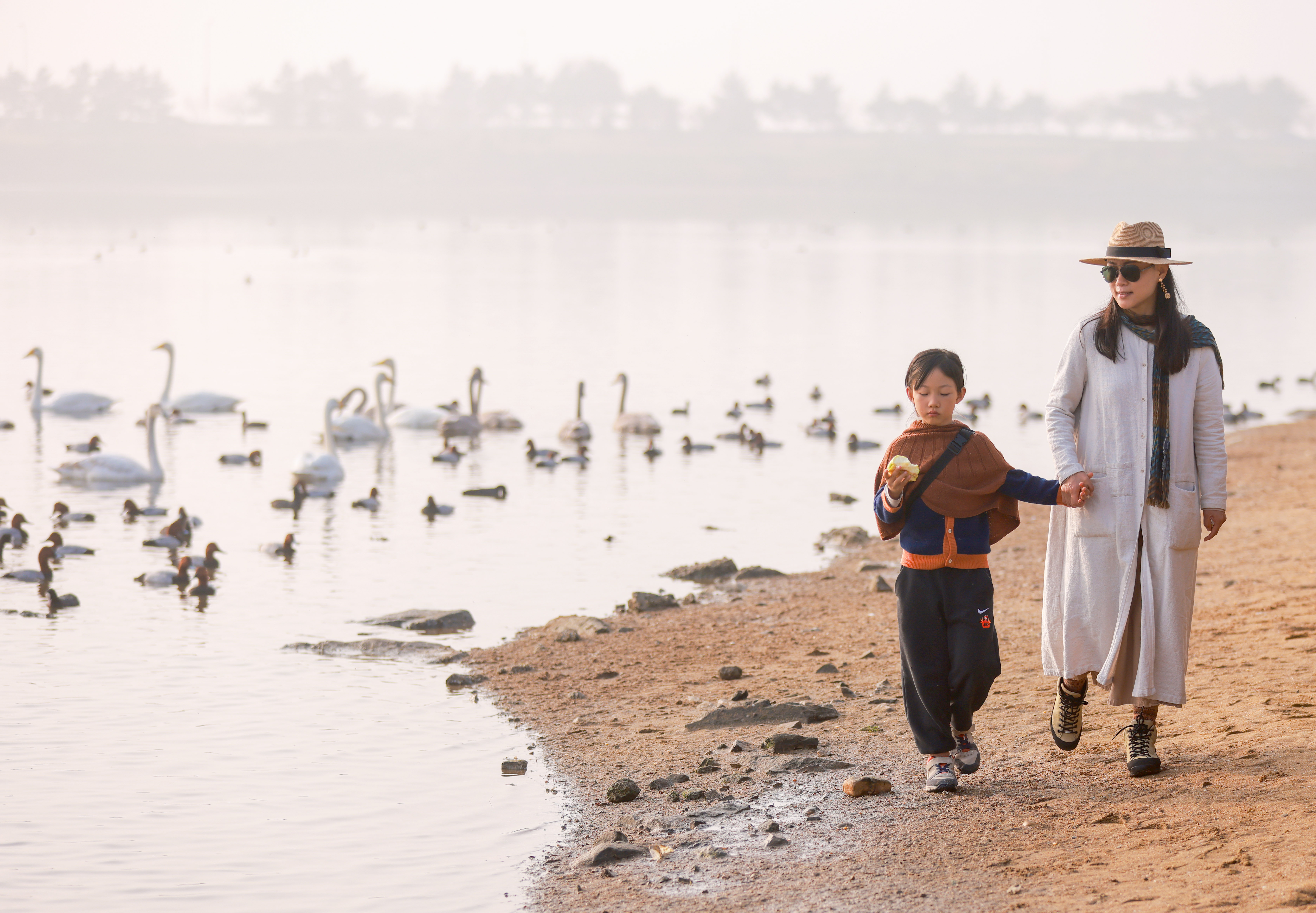 11月12日清晨,荣成市桑沟湾国家级湿地公园晨雾飘飘鸟鸣阵阵。朝阳中大天鹅翩翩起舞起舞、悠闲觅食。