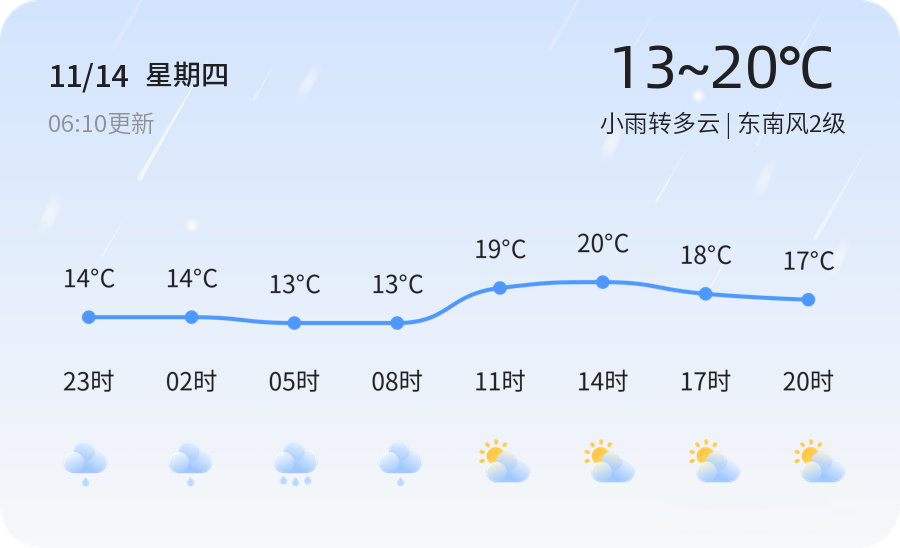 2024年11月14日,农历十月十四,菏泽市今日天气为小雨转多云,气温在13℃至20℃之间,东南风2级,空气湿度高达98%,PM2.5指数为94。全市各区普遍遭遇小雨天气,但午后逐渐转为多云,市民出行需携带雨具,并注意道路湿滑。