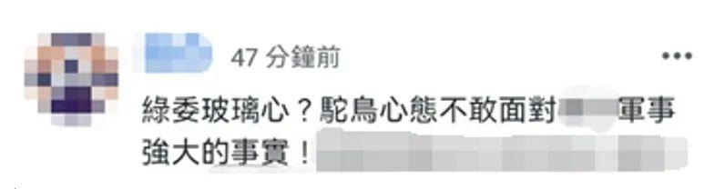 “‘绿委’玻璃心?”有网友说,“驼鸟心态不敢面对大陆军事强大的事实!”