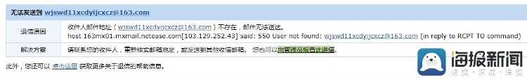 为了验证邮箱的使用情况,海报新闻记者随机向其中多个邮箱发送邮件,均显示邮件地址不存在,邮件无法送达。