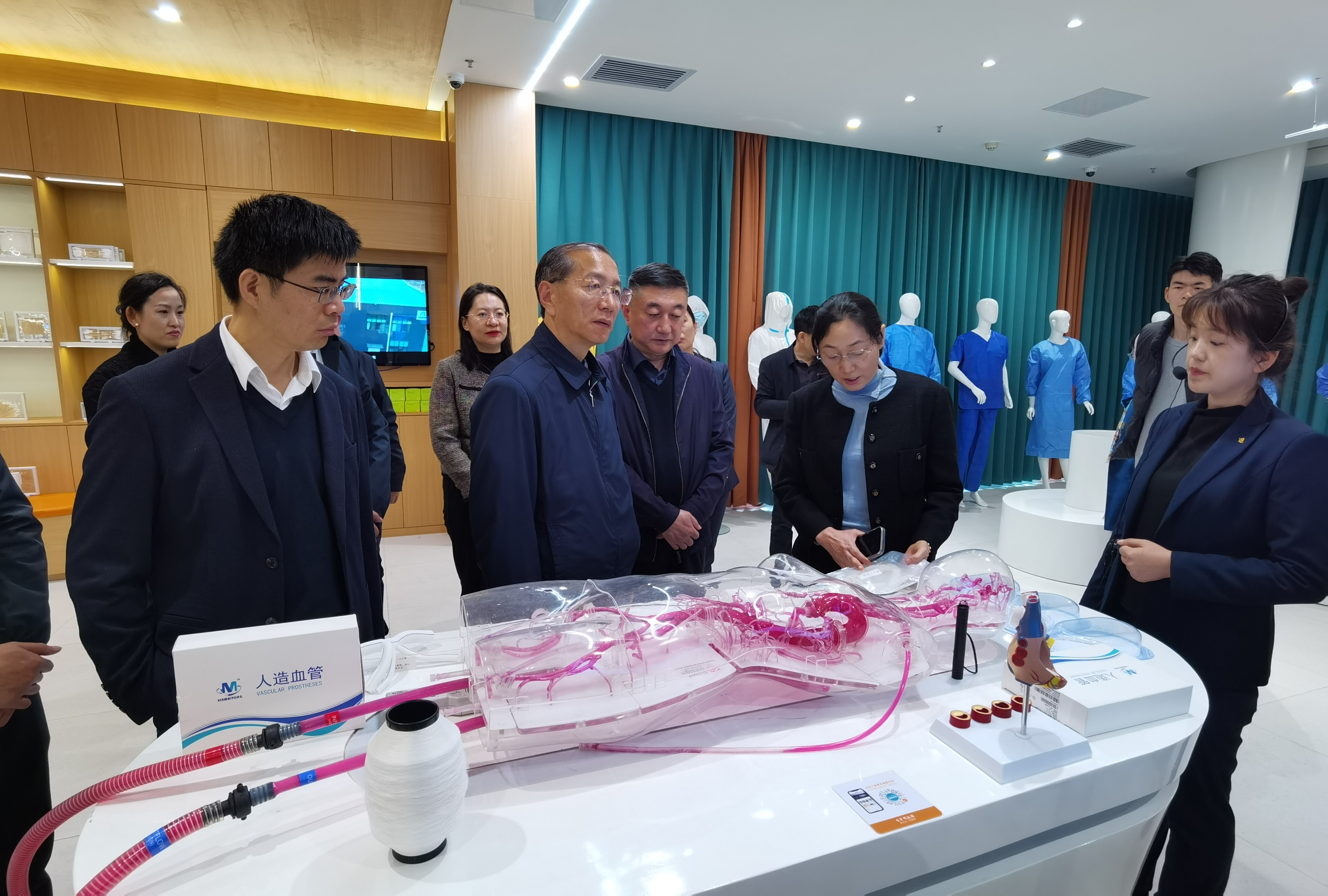 最后,赵竹村一行参观了愉悦家纺生命科技馆。观看了愉悦家纺在生命科技方面的创新成果产品,认真听取了企业负责人关于企业前景和公司运营进展情况的介绍,详细了解了企业的生产经营状况、技术需求以及人才培养情况,并对于学生的就业前景以及如何提升学生专业素质、实现毕业生与企业的无缝连接等方面进行了广泛交流。