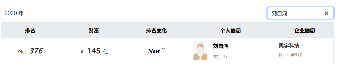 而随着柔宇科技估值一再上涨,至2020年,刘自鸿以145亿元身家登上了《胡润百富榜》,排名第376。