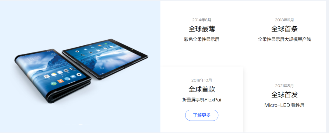 作为全球柔性电子科技行业的先行者,柔宇可以算是折叠屏手机“鼻祖”。柔宇科技早在2014年就发布了全球最薄的彩色柔性显示屏,颠覆式的创新引起广泛关注;2015年7月,柔宇科技启动了世界首条超薄柔性显示模组及柔性传感器量产线;2017年发布首款可搭载柔性显示屏和柔性传感器的柔性可卷曲穿戴手机原型FlexPhone;2018年又发布了全球第一款折叠屏手机FlexPai柔派。
