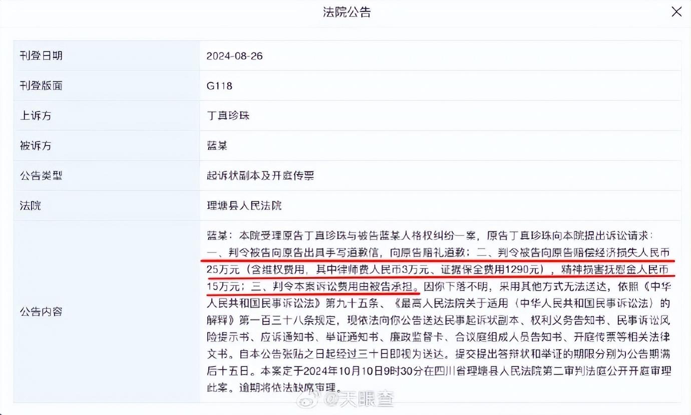 2024年8月,理塘县人民法院向蓝某公告送达丁真珍珠与其人格权纠纷一案民事起诉状副本、开庭传票等。公告内容显示,原告丁真珍珠诉请法院判令被告向原告赔礼道歉,并赔偿原告经济损失25万元、精神损害抚慰金15万元。