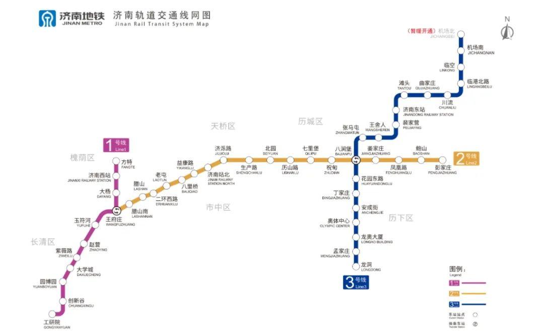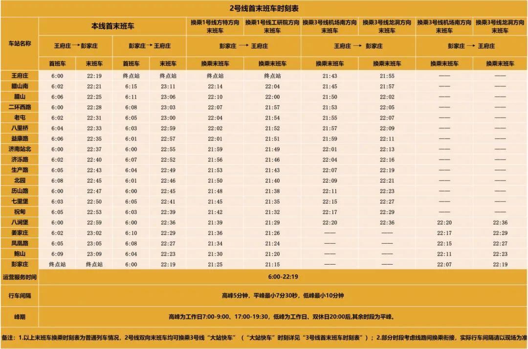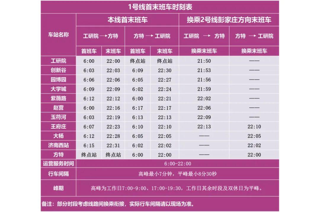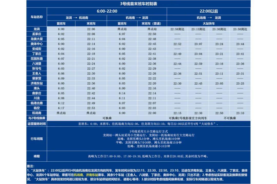 3号线二期初期运营后,济南地铁线网运营服务时间将同步优化调整,1号线为6:00-22:00;2号线为6:00-22:19;3号线首班车时间为6:00,往机场南站方向的末班车时间为22:06,往龙洞站方向的末班车时间为23:10,每日22:00以后开行4列“大站快车”。
