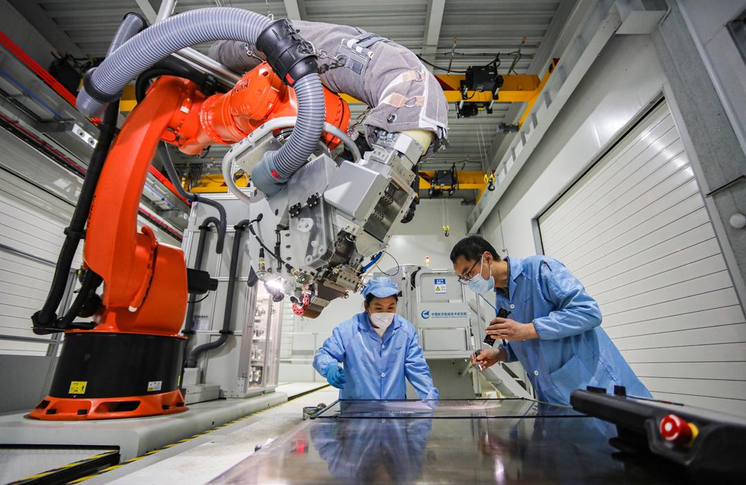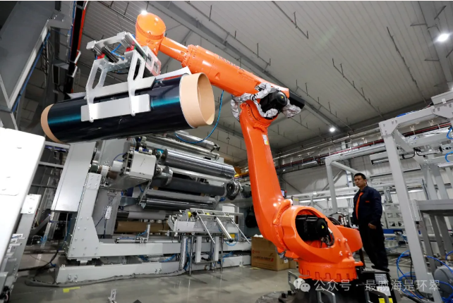 “宝威智能工厂”内,机器人灵活地绕过障碍物,把物料精准地送上传送带;无数个“纱锭”以同样的速度转动,一根根碳纤维被缓缓抽入“织布机”;一个个机械手臂在各自岗位上或搬运或装卸……“从物料进车间,到成品入库,全程不需要人参与。”姜波说。
