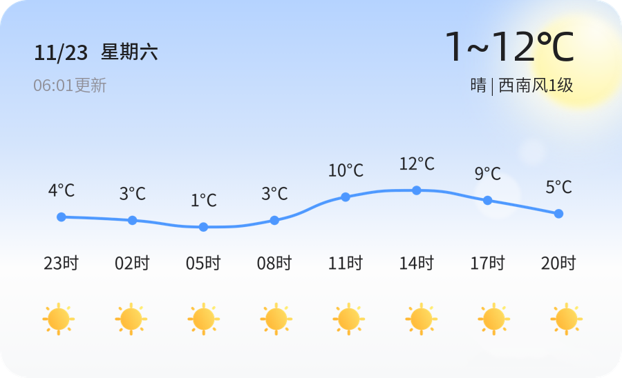 2024年11月23日,农历十月廿三,淄博今日天气以晴朗为主,早晨的气温降到了冰点以下,当前气温为-0.7℃,最低气温出现在今晨,达到了1℃,最高气温则为12℃,体感较为寒冷。淄博各区域均呈现晴朗天气,西南风1级,相对湿度高达95%,空气质量尚佳,PM2.5指数为42。市民外出需注意保暖,预防感冒。