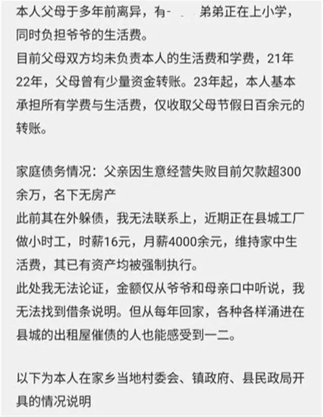 该学生在帖子中称,父母多年前离异,有一弟弟正在上小学,目前父母双方均未负责自己的生活费和学费,从2023年起,他仅收取父母百余元的转账。父亲还欠款超300余万,名下无房产,已有资产被强制执行;母亲在鞋厂务工,其名下也有数十万元债务。该学生说,自己曾多次转账给母亲帮其偿还信用卡,上述情况有当地村委会、镇政府等开具的情况说明。