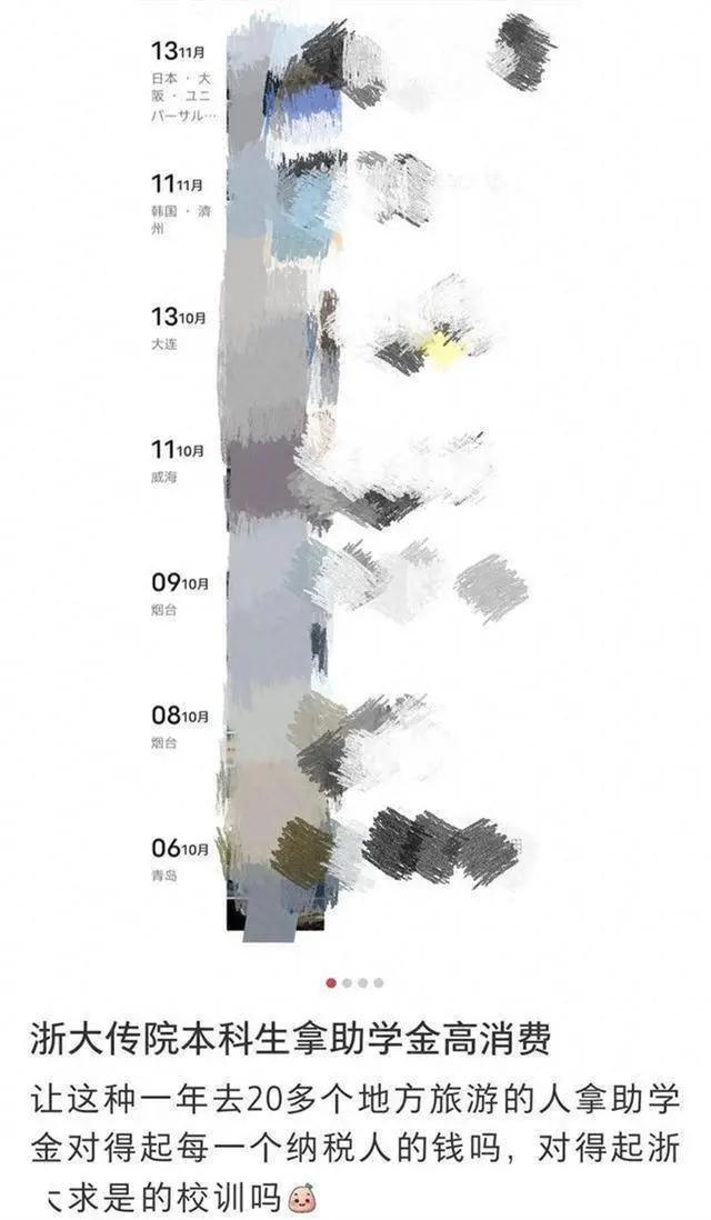 网友发布的信息显示,疑似该学生朋友圈从1月开始连发多地旅游打卡的照片,其中既有昆明、丽江、三亚等国内城市,也有韩国、日本等国家。网友质疑:“让这种一年去20多个地方旅游的人拿助学金,对得起每一个纳税人的钱吗?”