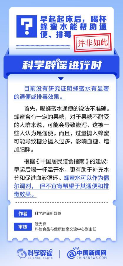 目前没有研究证明蜂蜜水有显著的通便或排毒效果。蜂蜜含有一定的果糖,对于果糖不耐受的人群来说,可能会导致腹泻,这被一些人认为是通便。而且,过量摄入蜂蜜可能导致糖分摄入过多,影响血糖、增加肥胖。(来源:@科学辟谣 中国新闻网微博)