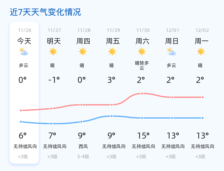 2024年11月26日,农历十月廿六,菏泽市迎来了多云转晴的天气,早晨气温较低,仅为0.9℃,但白天气温逐渐回升,最高气温达到6℃,西风2级,空气湿度保持在60%,,PM2.5指数为54。各区域天气情况大致相同,均以多云转晴为主,市民们可适时外出活动,享受初冬的暖阳。