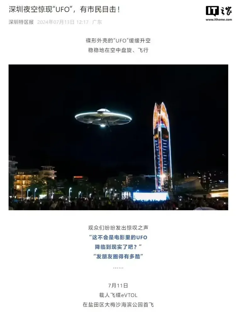 今年7月,这台飞碟曾在深圳盐田区大梅沙海滨公园首飞。它具备高效的空中交通能力,还可以为低空旅游、城市物流等提供创新解决方案。其飞行高度为10-30米,若发生迫降,也可安全浮在水面上,且支持自动避障。