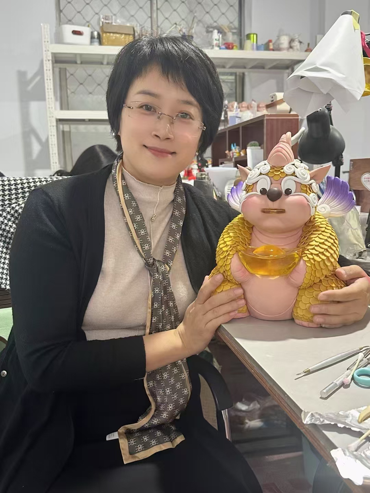 软陶泥塑产品貔貅“金𨰻𨰻”,由淄博文旅集团与小虾米软陶工作室联名设计制作。貔貅是中国传统神话中的一个瑞兽,有辟邪、开运、招财进宝之意。该作品结合了软陶泥塑、琉璃两种淄博非遗技艺,创作了一个胖乎乎的金色貔貅,纯手工制作,历经塑形、修型、贴脸、贴鳞片、加龙尾、做祥云装饰、烤制、喷色等12个软陶泥塑步骤。同时,加入了淄博非遗琉璃——“金𨰻𨰻”手捧琉璃金元宝、口含琉璃金币。
