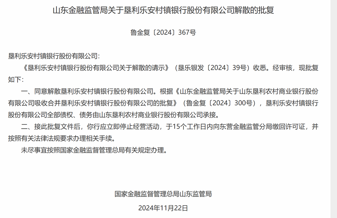 大众新闻记者从国家金融监督管理总局山东监管局官网看到,11月25日,其发布关于垦利乐安村镇银行股份有限公司解散的批复,经审核,同意解散垦利乐安村镇银行股份有限公司。