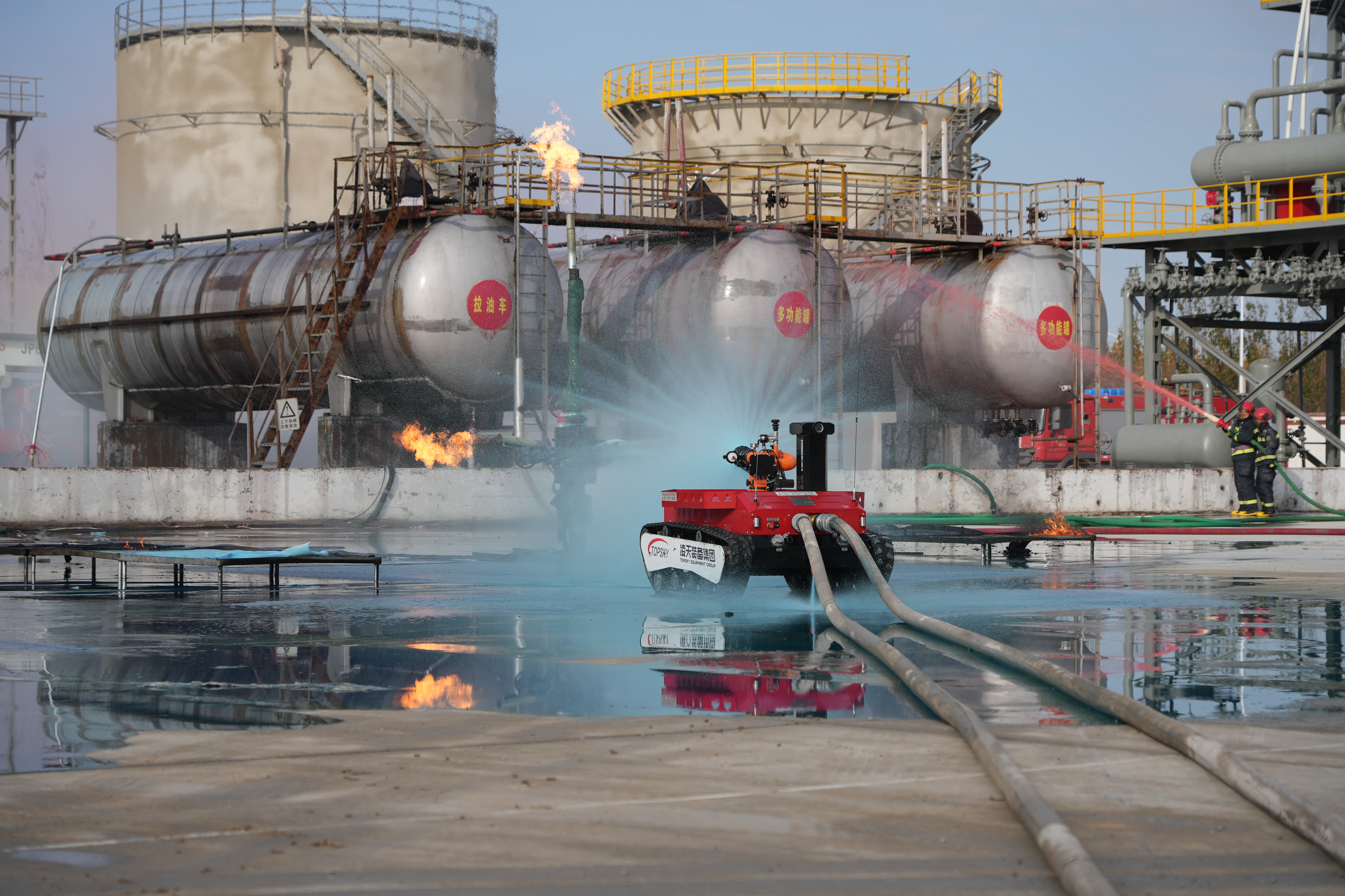 被困人员被成功营救后,现场监护部署的冷却和灭火力量同时开展行动。指挥员指令涡喷消防车对硫化氢逸散区域进行正压式强力吹扫,为后期处置创造条件。最后,在大跨距消防车、60米高喷消防车和消防机器人的全力扑救下,现场明火被扑灭,实训展示圆满结束。