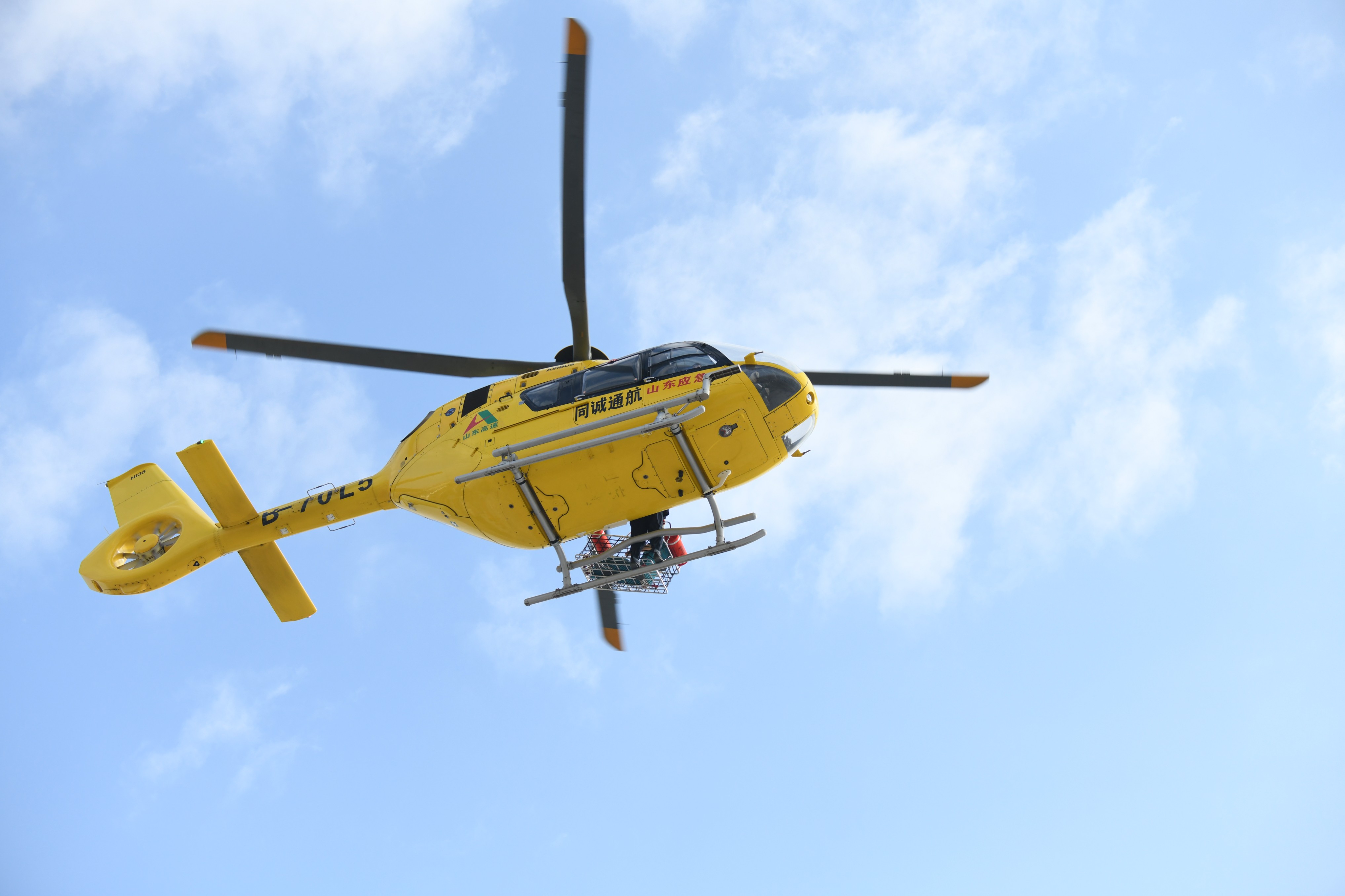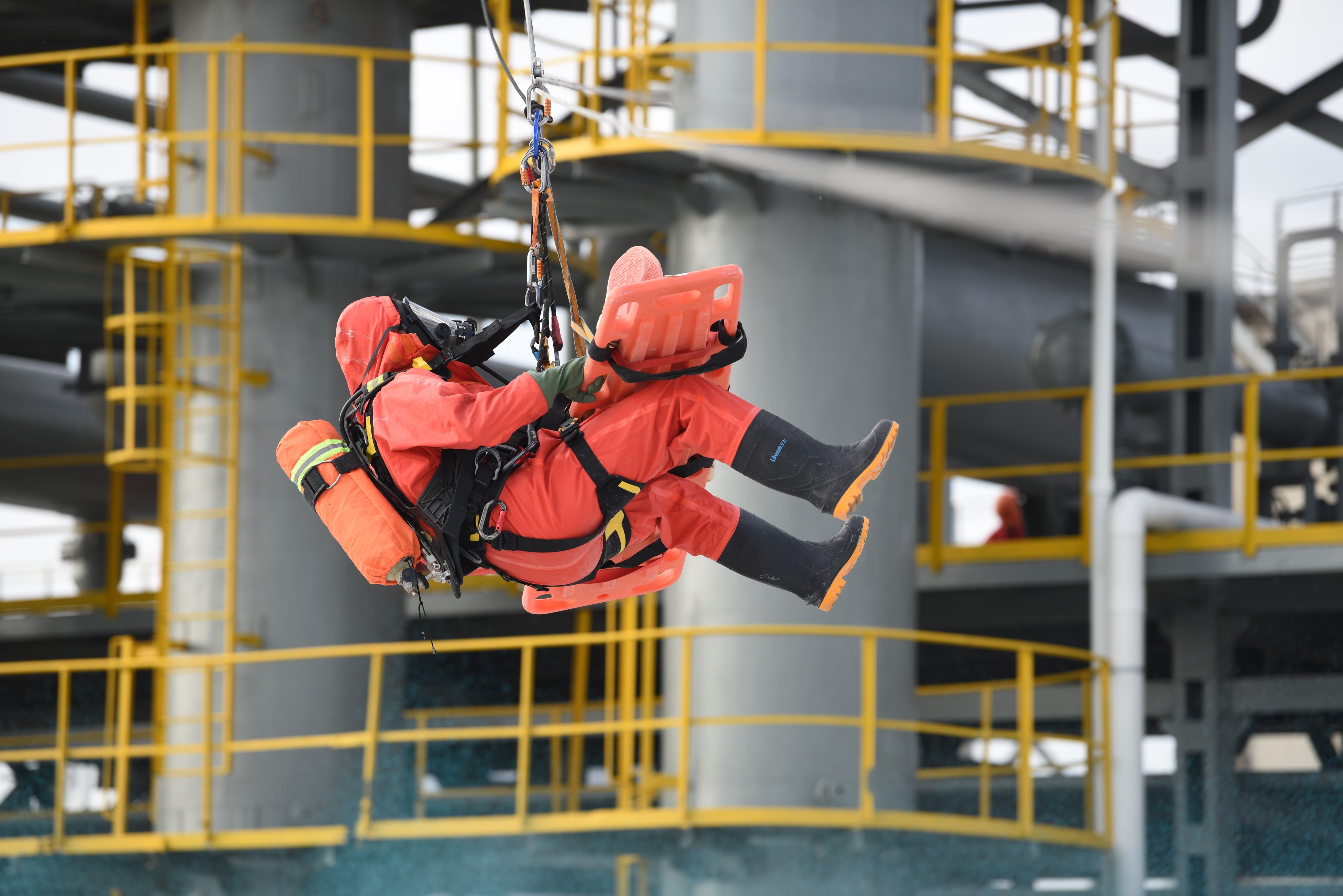 在随后的高风险作业监护现场救援实战科目展示中,救援人员分别在MTBE装置三层平台和地面安全区域搭建人员抢救运输索道,将硫化氢中毒的“受伤人员”安全送至地面,并利用救援直升机转送至医疗救助地点。