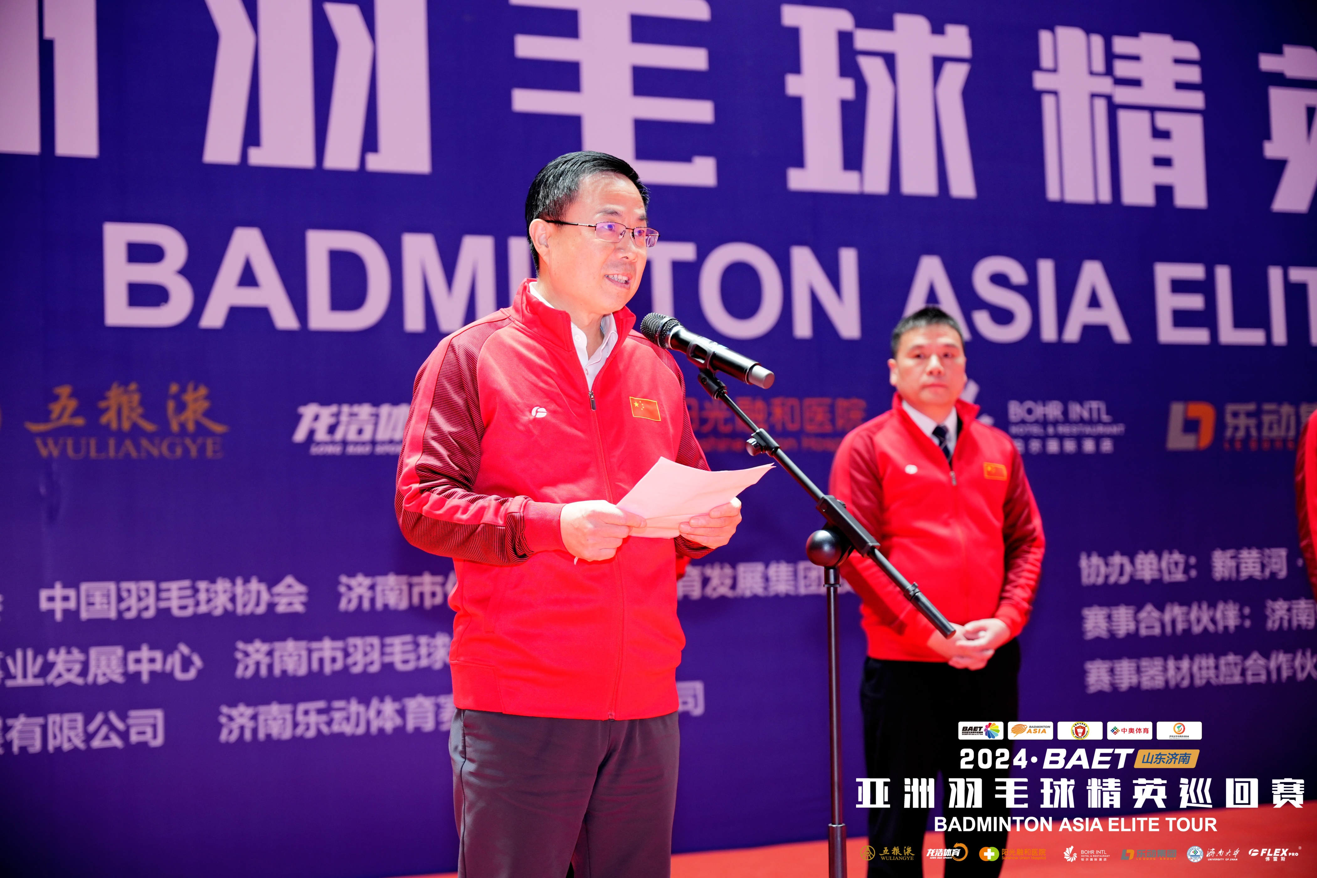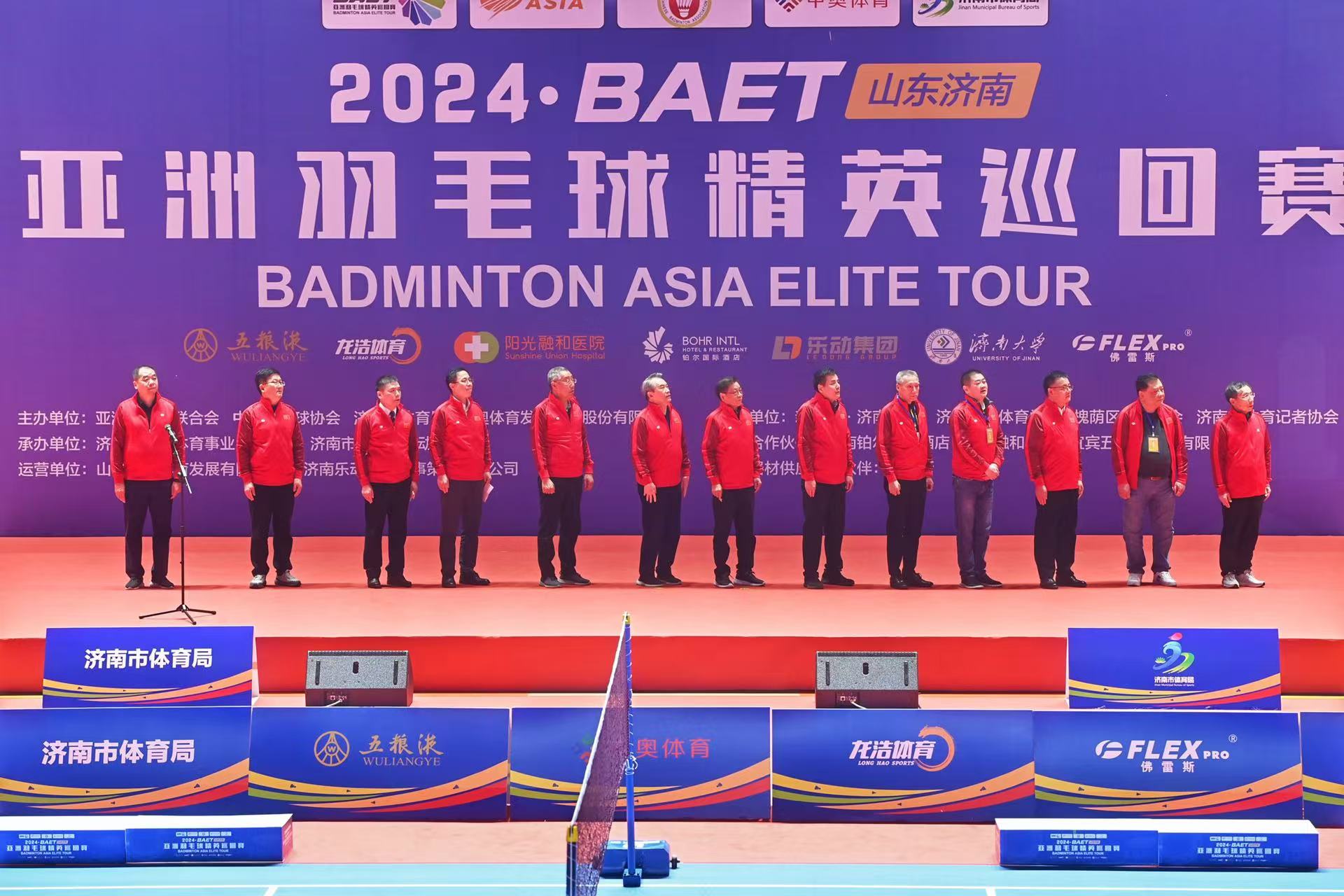 2024年亚洲羽毛球精英巡回赛(济南站)由亚洲羽毛球联合会、中国羽毛球协会、济南市体育局、中奥体育发展集团股份有限公司主办,济南市群众体育事业发展中心、济南市羽毛球协会承办,济南铂尔国际酒店、阳光融合医院、宜宾五粮液股份有限公司等提供赛事联合支持,赛事器材合作伙伴是佛雷斯(广州)体育科技有限公司。山东省体育局原党组书记、局长李政,山东省体育局党组成员、副局长王强,山东省乒羽中心主任马安会,济南市群众体育事业发展中心主任王震宇,济南市槐荫区体育事业发展中心党组书记、主任李卫东,济南市羽毛球运动协会会长翟世标等出席开幕式。