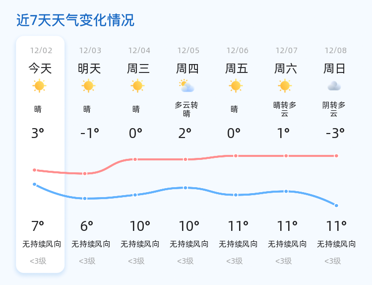 与今日相比,明日济南的天气将出现小幅变化。根据天气预报,12月3日,济南依然保持晴朗,但最低气温将下降至-1℃,最高气温为6℃,昼夜温差较大,市民需做好保暖措施,避免感冒。同时,无持续风向的风力小于3级,整体风速较小,空气质量可能略有改善。