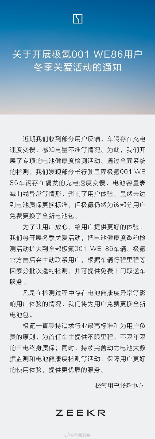 从官方发布的活动通知可以看到,官方称近期收到部分用户反馈,车辆存在充电速度变慢、感知电量不准等情况。为此,公司开展了专项的电池健康度检测活动。通过全面系统的检测,发现部分长行驶里程极氪001 WE86车辆存在偶发的充电速度变慢、电池容量衰减曲线异常等情形,影响了用户体验。虽然未达到电池质保更换标准,但极氪仍然为该部分用户免费更换全新电池包。