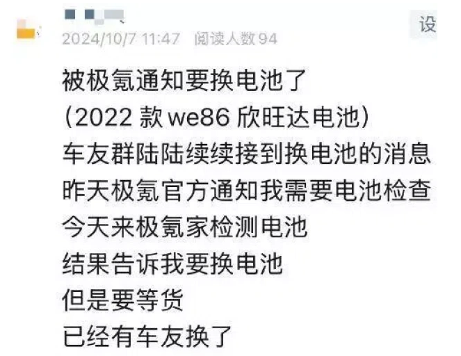 此外,从网友们在网络发布的帖子可以看到,极氪官方从10月开始就通知极氪001 WE86车主检测车辆,对有问题的电池进行更换。