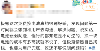 对于官方此次终身质保电池可免费换的服务,也得到了不少网友的支持。有网友表示,极氪这次免费换电池真的很刷好感,发现问题第一时间就会想到和用户去沟通、解决问题,说实话,电池衰弱问题,懂行的都知道是不可逆的,换一块电池的成本有多高,但极氪情愿自己掏钱,也要为用户兜底。还有网友表示:极氪反应挺快,算是对前段时间极氪001 WE版86度电车主遇到的充电慢,锁电等情况做了回应了。