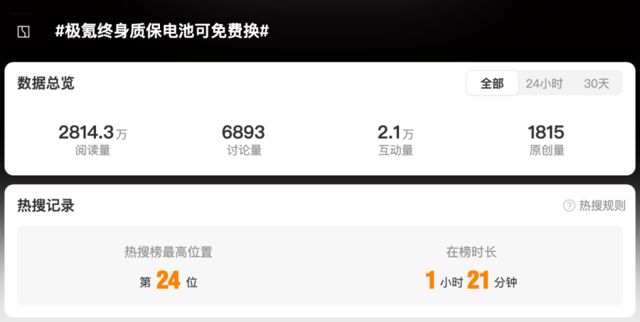 今日,极氪终身质保电池可免费换的话题登上了微博热搜位置,引发了大量网友的关注。截止发稿,该词条的阅读量高达2798.4万,讨论量达6688条。据了解,极氪官方在今天发文宣布,极氪001 WE 86用户可免费更换全新电池。