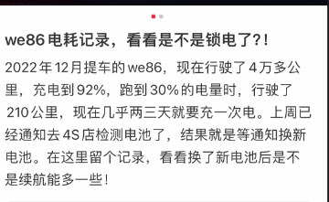 汽车行业关注在网络搜索发现,10月开始在社交平台上就有很多车主发帖称自己购买的极氪001 WE86车辆存在电池充电速度变慢、电池容量异常等问题。有网友发帖称:自己是在2022年12月提车的we86,现在行驶了4万多公里,充电到92%,跑到30%的电量时,行驶了210公里,现在几乎两三天就要充一次电。