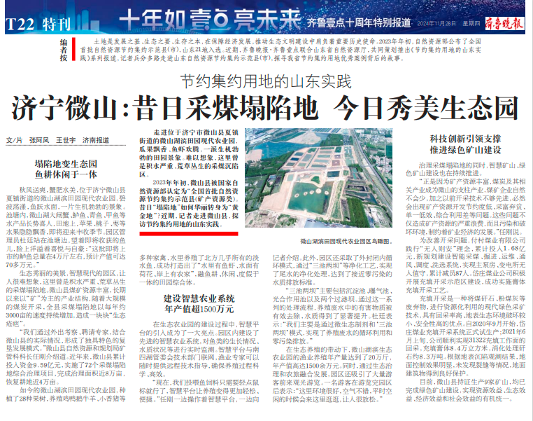 2023年年初,微山县被国家自然资源部认定为“全国首批自然资源节约集约示范县(矿产资源类)。昔日“塌陷地”如何华丽转身为“黄金地”?近期,记者走进微山县,探访节约集约用地的山东实践。