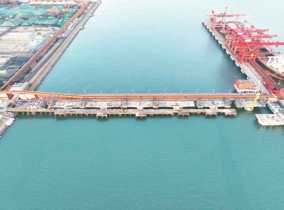山东港口青岛港董家口港区第二座40万吨级矿石码头引桥首段合龙施工完成