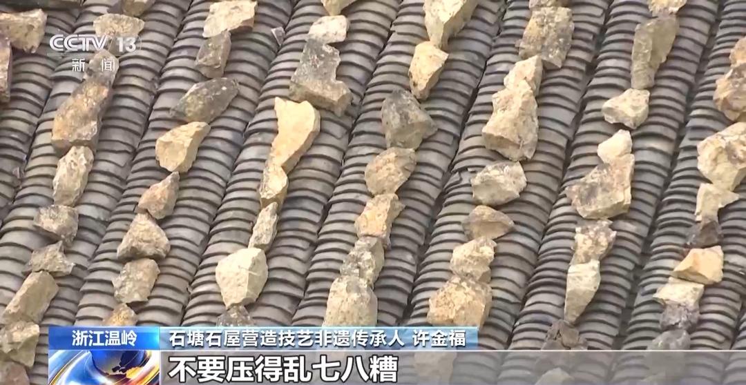 石塘石屋营造技艺非遗传承人 许金福:一般都是两排交界的中线,石头都是压在中间这一排,这样子压起来的防止台风,一般都不会刮掉的,它主要就是保持瓦片稳定性。一般压的石头就是压得整齐一点,不要压得乱七八糟,压得好坏要凭师傅的眼光。
