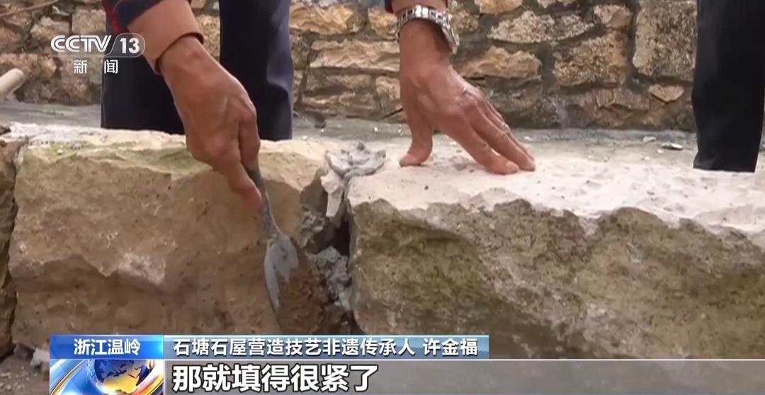 石塘石屋营造技艺非遗传承人 许金福:一般先放蛎灰,摔进去里面就紧实一点,再放一块小石块,用泥刀敲一下,那就填得很紧了。这样子就防止它漏水,防止刮台风水跑到里面去,另外一个作用是让两个石头粘在一起,紧固一点。