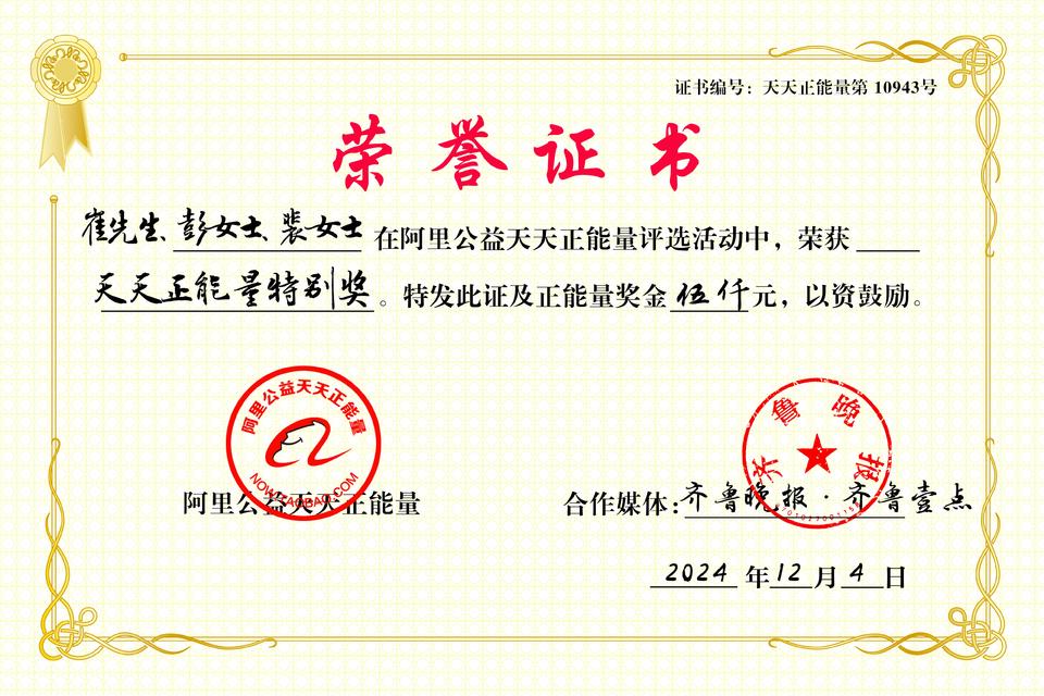 阿里公益天天正能量了解到事件经过后,决定联合齐鲁晚报·齐鲁壹点授予 裴女士、崔先生和彭女士三人“天天正能量特别奖”,奖金五千元,颁奖词: