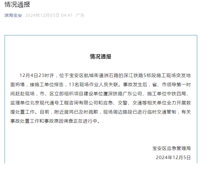据深圳市宝安区区委宣传部官方微信公众号5日通报,12月4日23时许,位于宝安区航城街道洲石路的深江铁路5标段施工现场突发地面坍塌,接施工单位报告,13名现场作业人员失联。