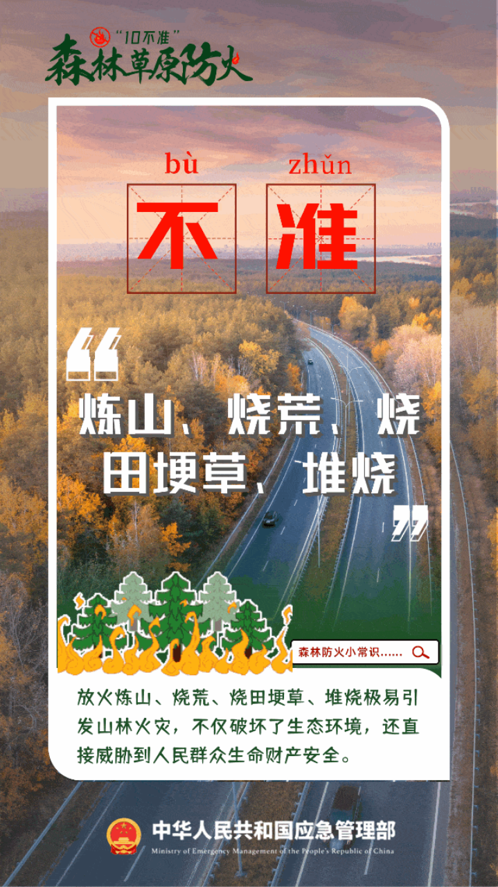 11月1日开始,山东省进入秋冬季森林火灾多发易发的敏感时段,省应急厅发出提醒:森林火灾重防范,严控火源是关键,防范森林草原火灾,“十不准”要记心间!