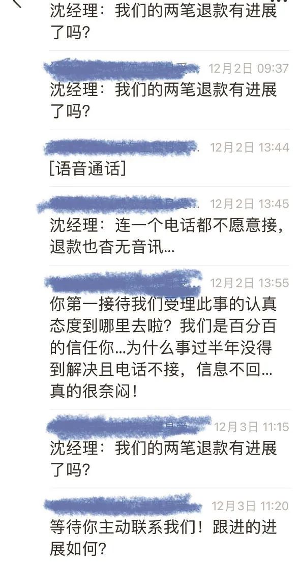退款究竟何时能到账?徐汇苑门店回复,哪里办卡去问哪里,这边只能查看自家门店的退款进度,不知晓尚汇豪庭门店的10年卡退款情况。接着又说,“审批层级很多,流程长”,所以消费者在徐汇苑门店办理的3年卡也确定不了哪一天会收到退款。