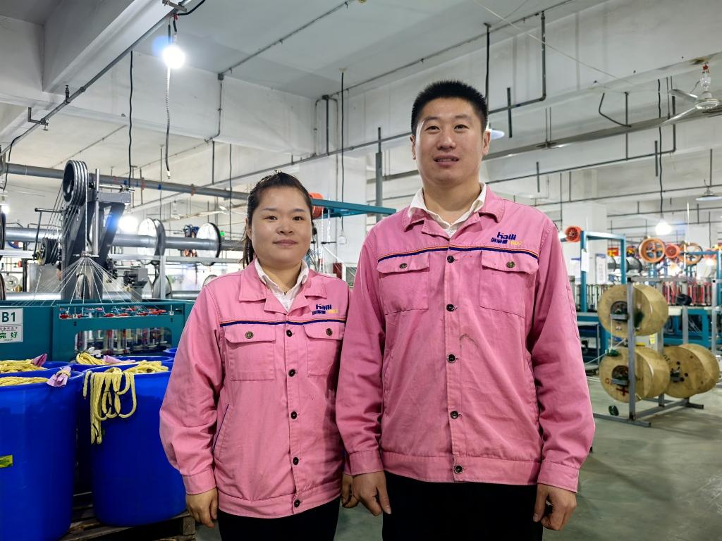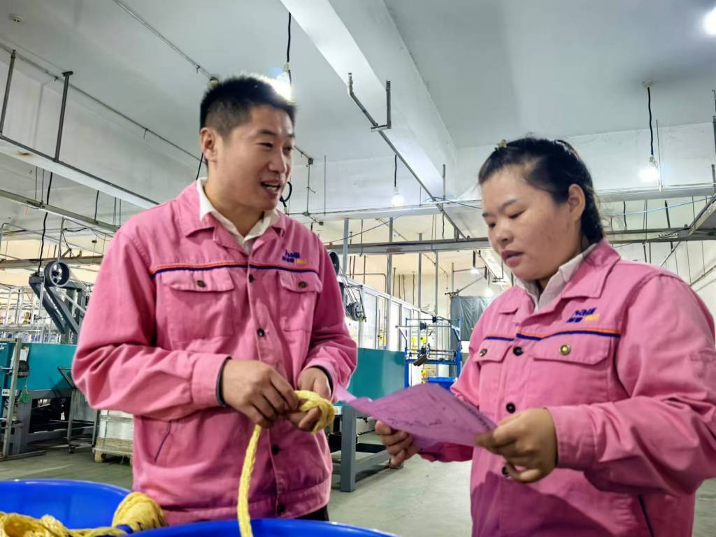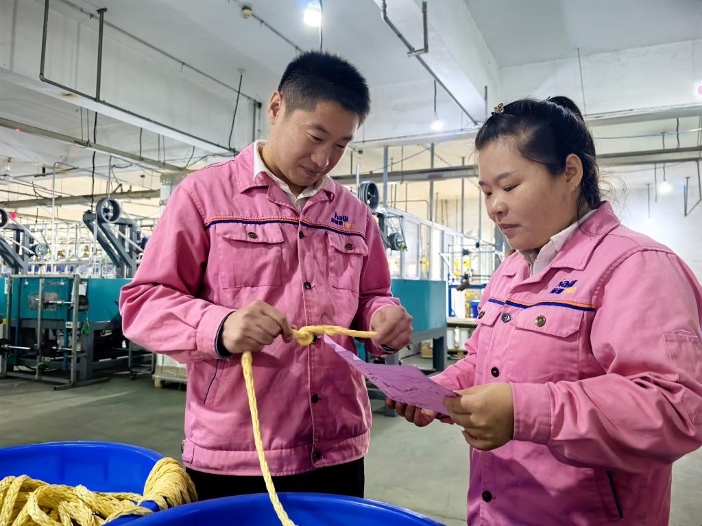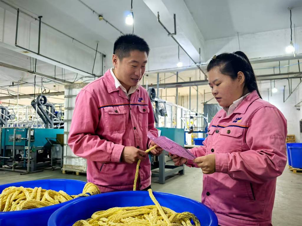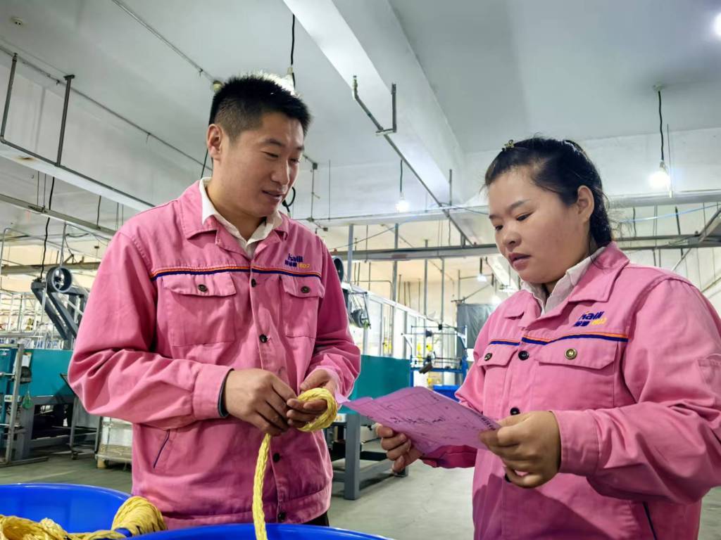 妻子赵秀川现在是海丽雅绳缆生产检验部班长,两人同岁、同为莒县人。初见赵秀川,是在工厂车间二楼,她正在检验产线送来的一批绳缆。“我生产完她检验,反正生活、工作她都能把我轻松拿捏。”说这话时,郭成志满脸通红,但笑得很幸福。