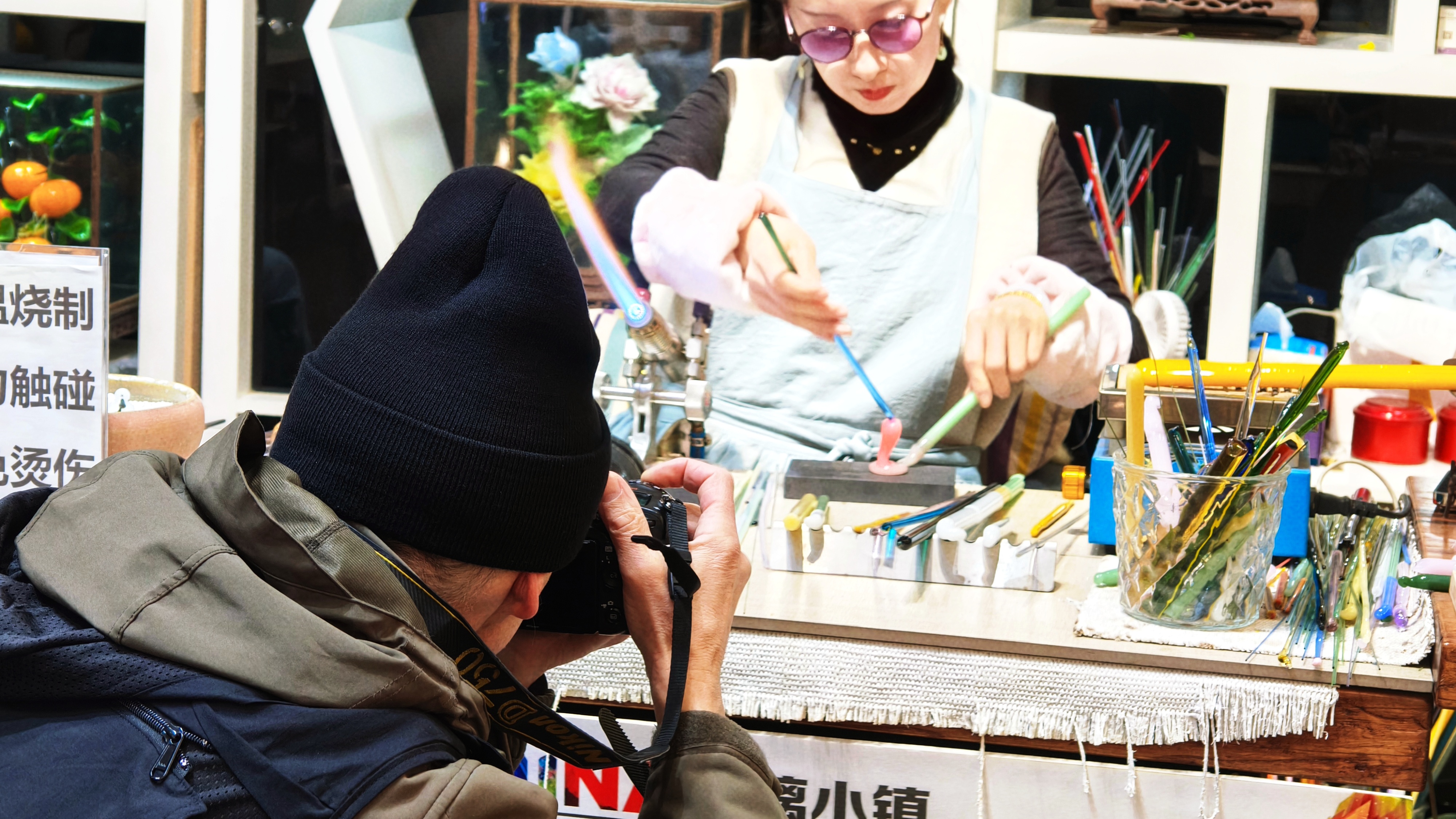 在人立琉璃展销厅,更多的是多元化、与时俱进的新产品。荷花、铃兰、仙人掌等造型精美的琉璃盆栽,蚂蚱、金鱼、鹈鹕等形神兼备的琉璃摆件,以及兼有艺术美感和实用价值的日用碗盘……这些融入了更多潮流文化创意元素的小件琉璃,则让摄影家们多了几分现场“淘宝”的乐趣。