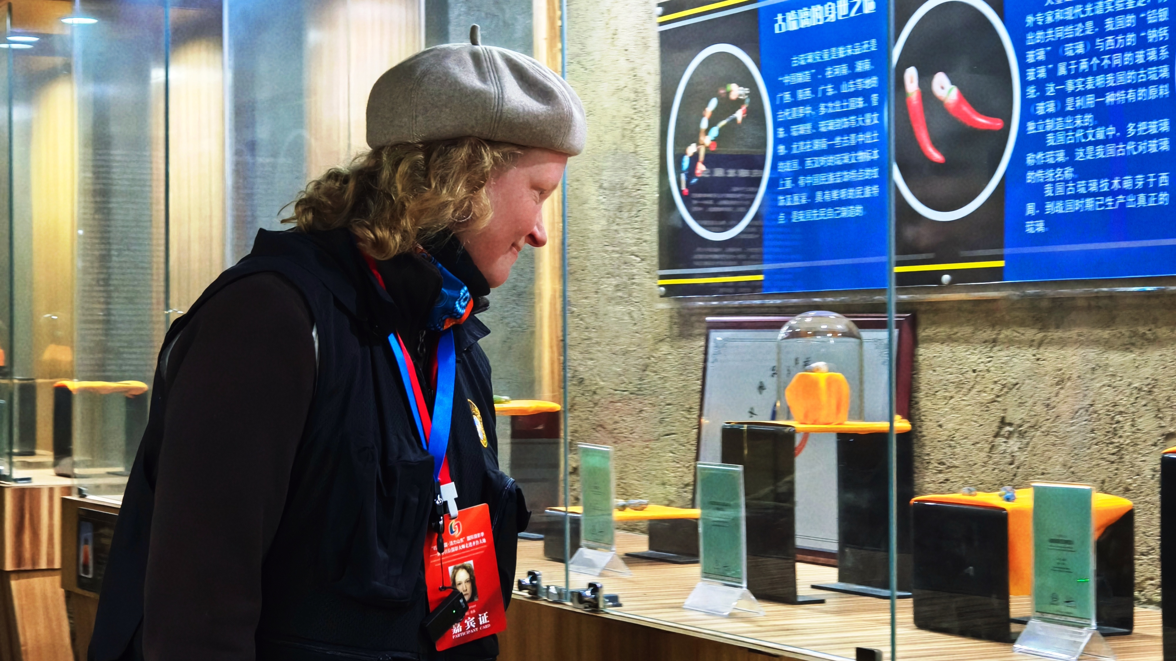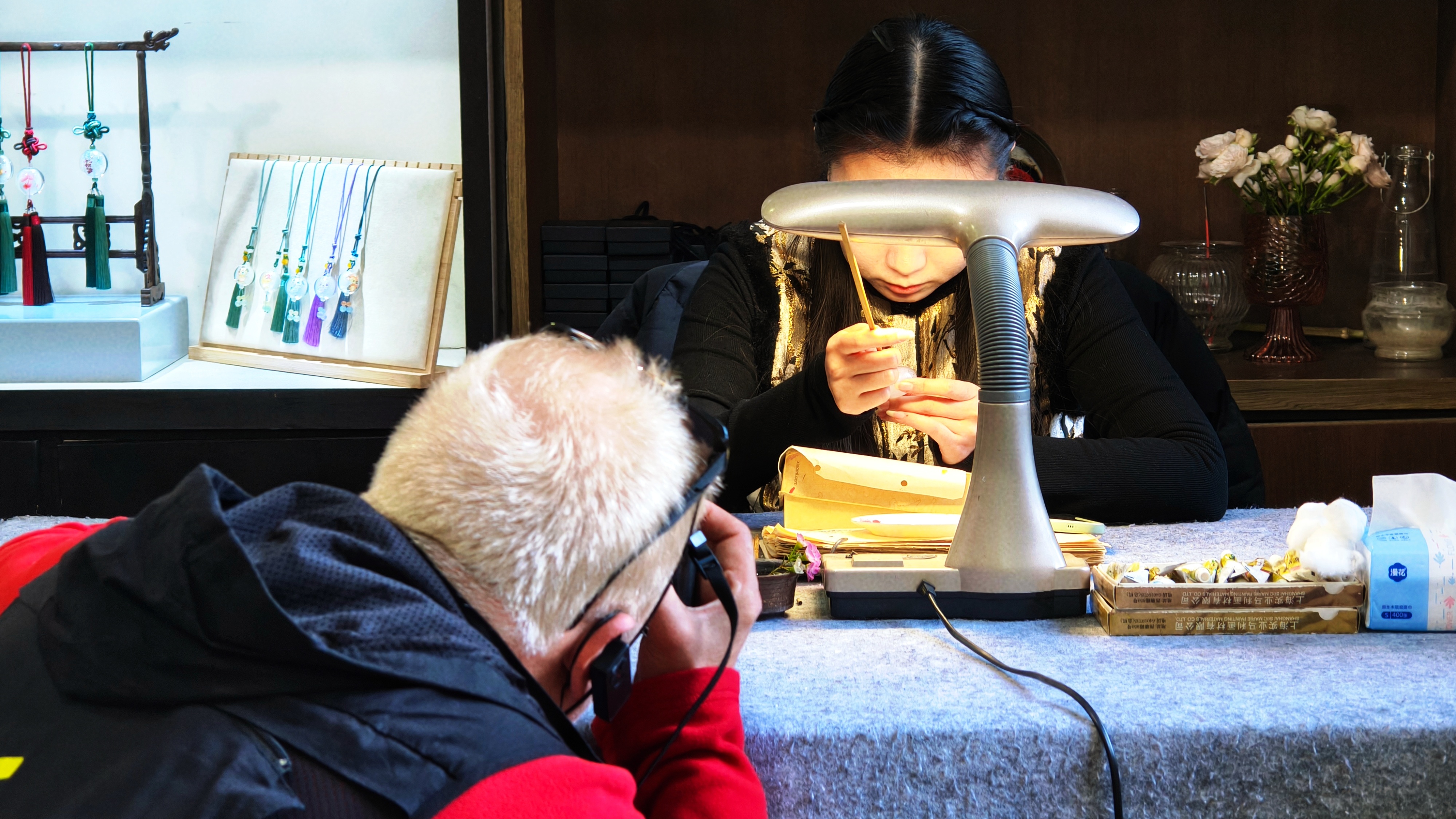 “您好,我想买这两条琉璃手串,带回国送给我的家人!”看着造型小巧精致的琉璃手工手串和鸡油黄小葫芦吊坠,来自意大利的摄影师马里奥•乔尼向工作人员询问着价格。