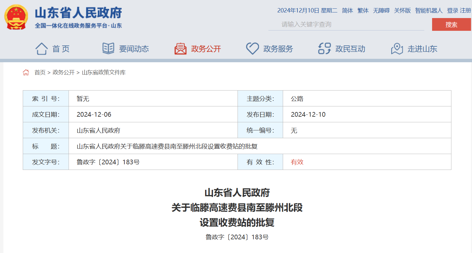 12月10日,山东省政府网站发布《山东省人民政府关于临滕高速费县南至滕州北段设置收费站的批复》。