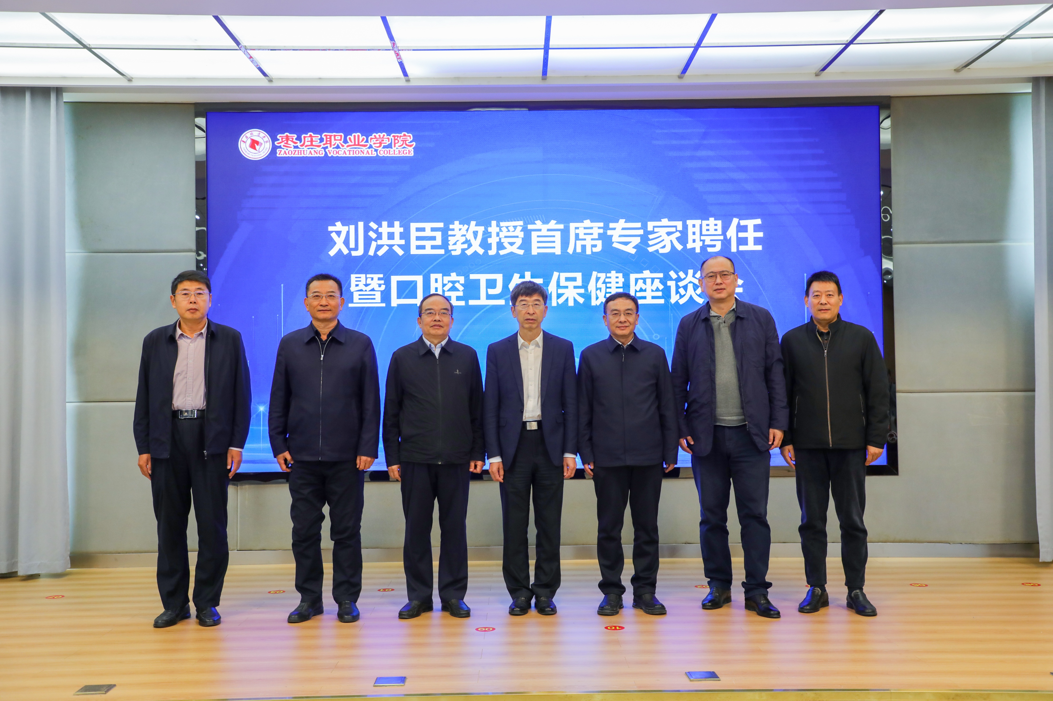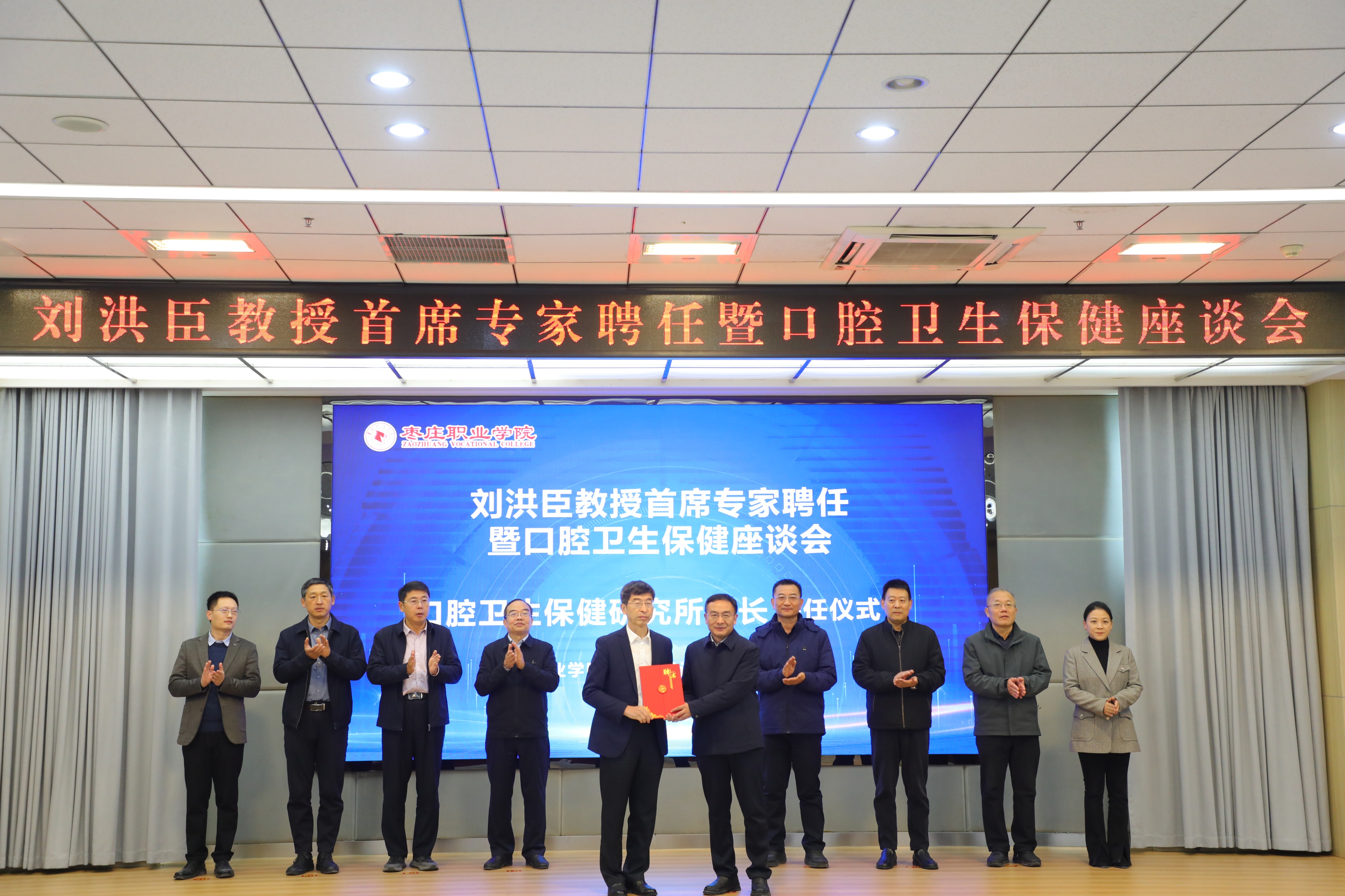 学院党委副书记、院长梁家和为刘洪臣教授颁发枣庄职业学院首席专家聘书、口腔卫生保健研究所所长聘书。