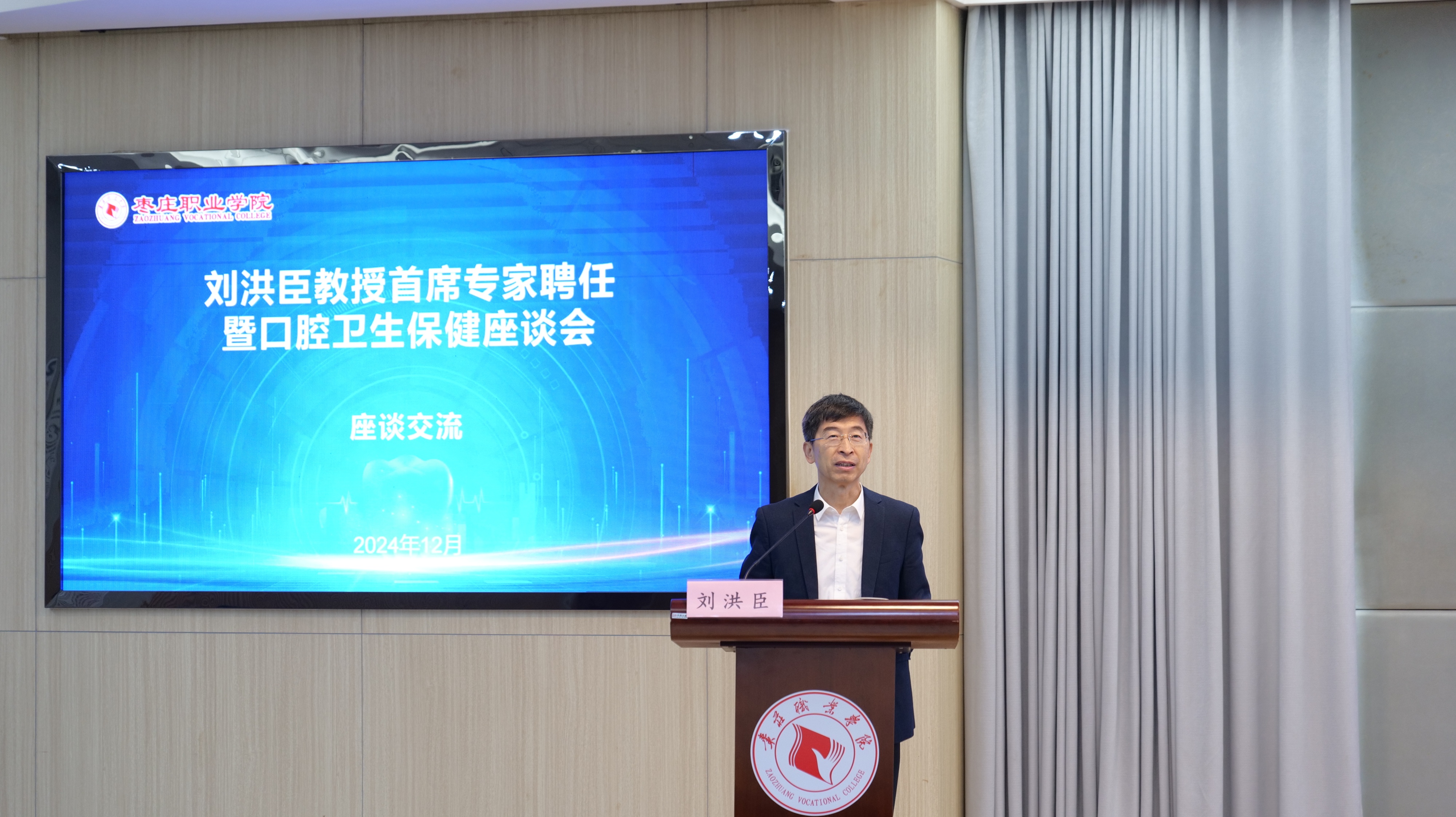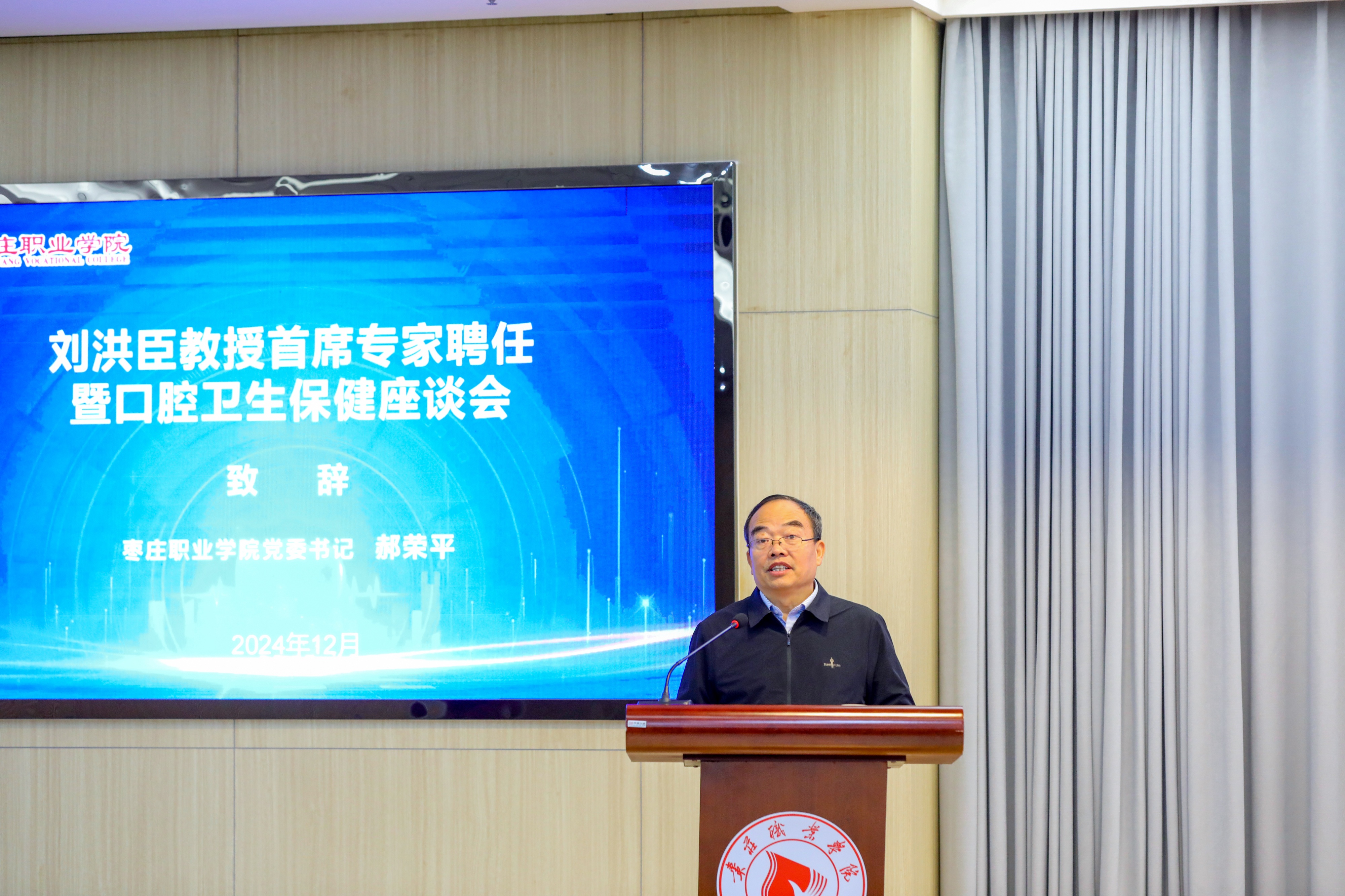 12月6日,枣庄职业学院在学术报告厅举行刘洪臣教授首席专家聘任暨口腔卫生保健座谈会。学院领导郝荣平、梁家和、张华伟、王念、闫博、郝艺出席,学院相关部门负责同志、医学院负责人及口腔卫生保健专业师生代表参加会议。