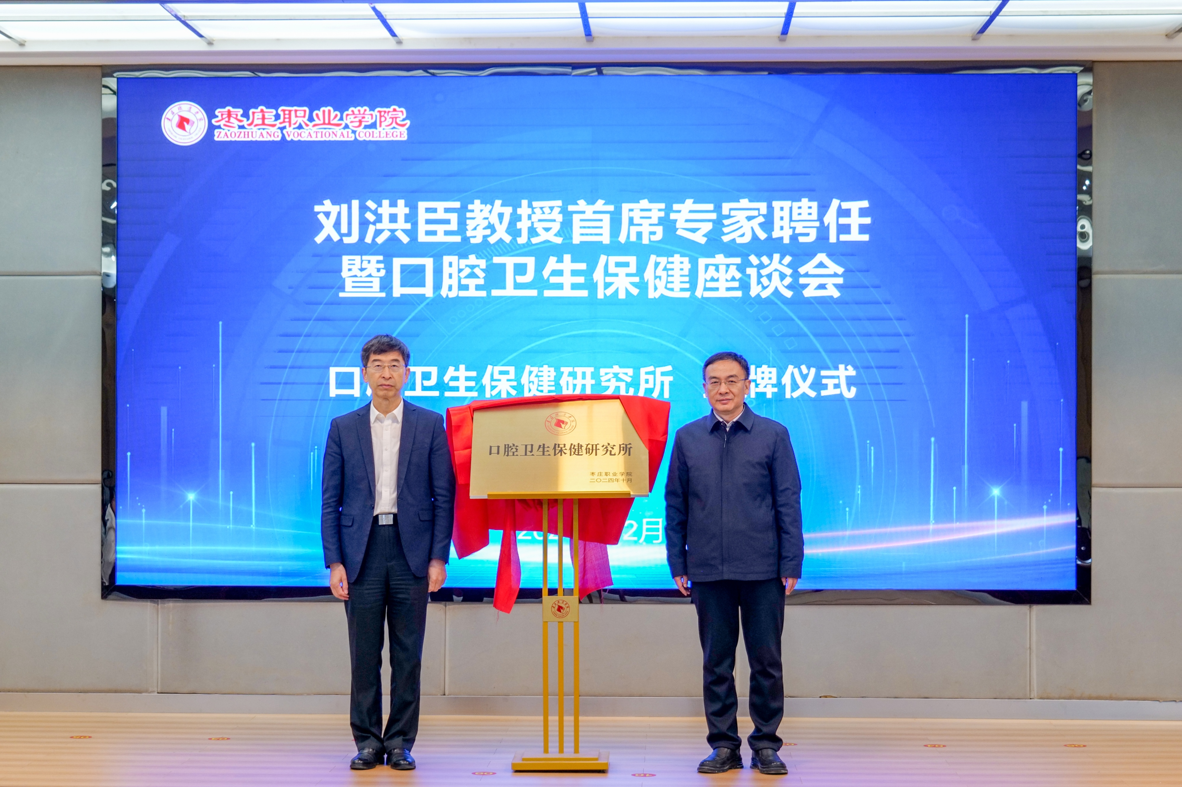 刘洪臣教授、梁家和院长共同为口腔卫生保健研究所揭牌,标志着第一个针对口腔卫生保健专业发展和口腔卫生技师人才培养的专门研究机构在枣庄职业学院成立。