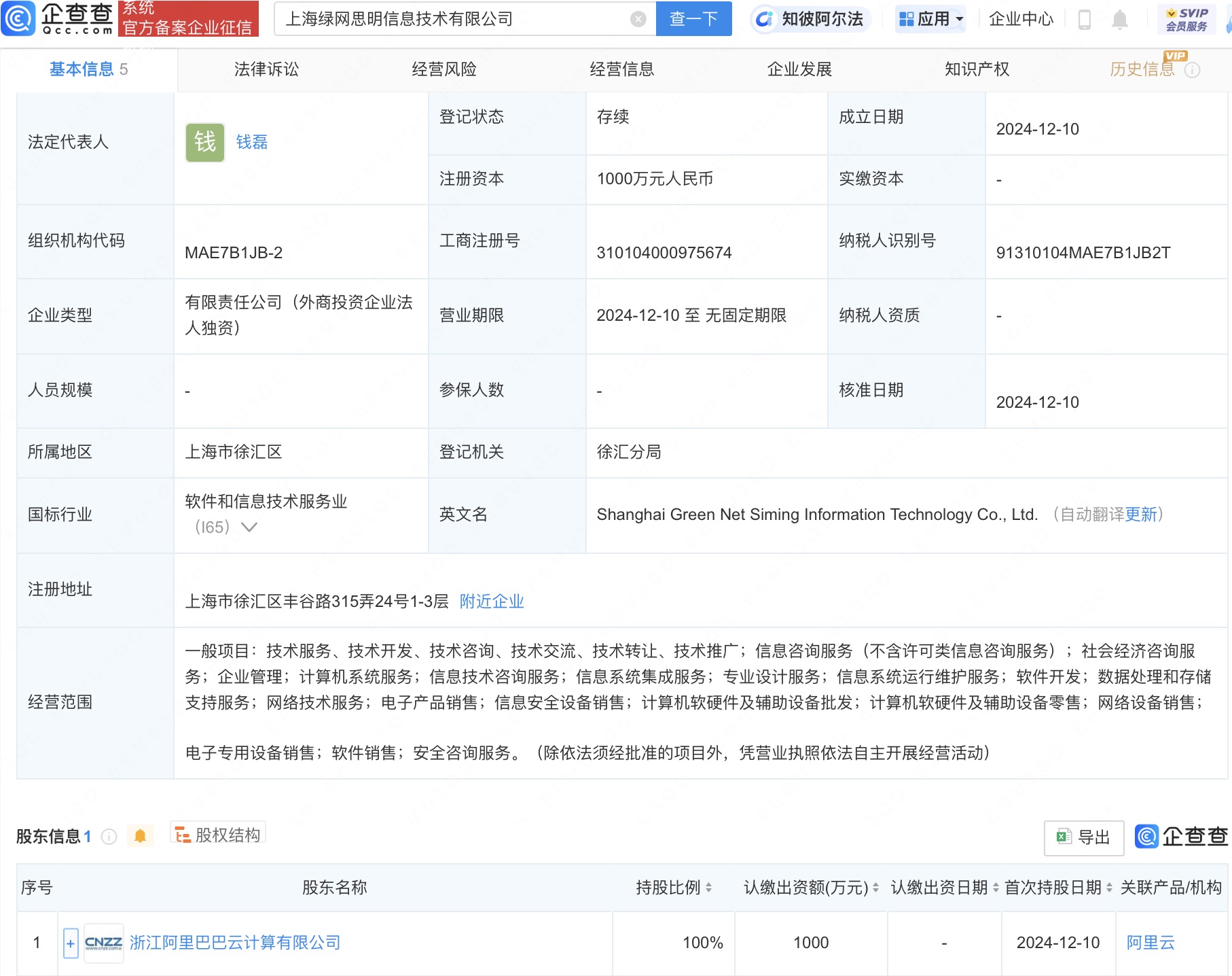 企查查APP显示,近日,上海绿网思明信息技术有限公司成立,法定代表人为钱磊,注册资本1000万人民币,经营范围含信息咨询服务、社会经济咨询服务、信息技术咨询服务、信息系统集成服务等。企查查股权穿透显示,该公司由浙江阿里巴巴云计算有限公司全资持股。