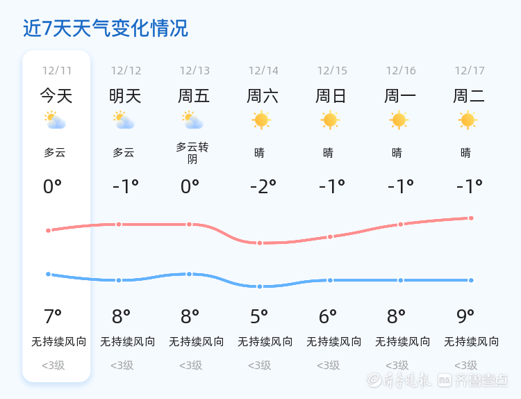 明天,即12月12日,济南的天气状况与今天相似,依然以多云为主,气温略有上升,最低气温-1度,最高气温8度,无持续风向小于3级。相比今天,气温的小幅波动不会对市民生活造成太大影响,但早晚温差较大,市民还需适时增减衣物。