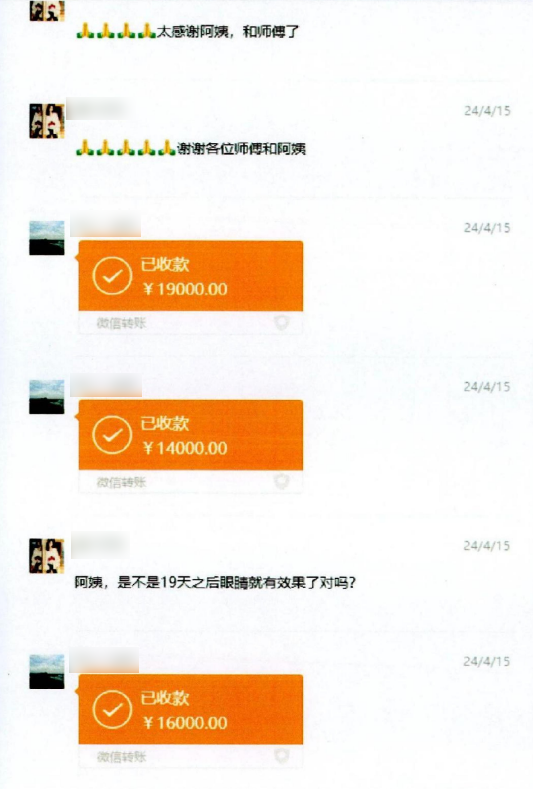4月15日,张女士感情不顺,觉得自己“没看清人”,便向祖某咨询“开天眼”的相关事宜。祖某谎称可以找九华山“师傅”帮助她“开天眼”,通过“开天眼”即能看清一个人的好坏,并称“开天眼”需要19天。于是,张女士又分三次通过微信支付了近5万元。