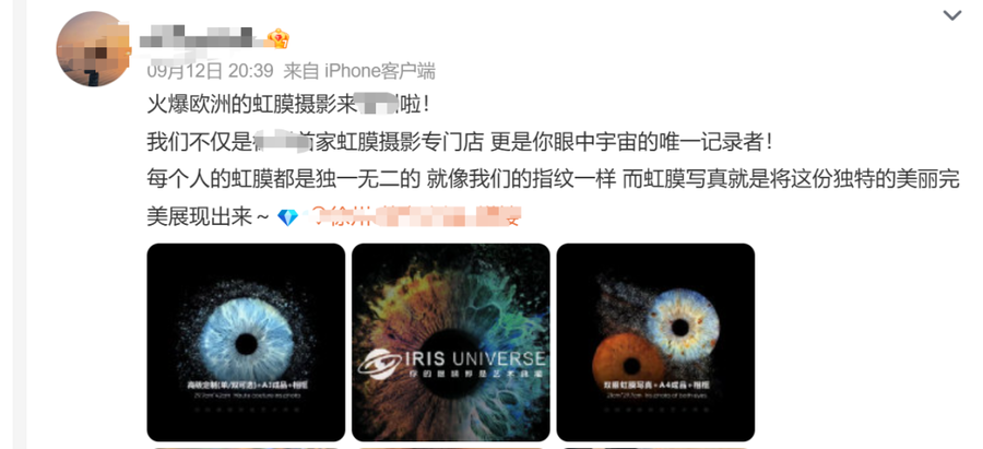 有从业者表示,虹膜识别需要通过活体检测,捕捉眼球运动轨迹来进行识别的,而虹膜写真是静态的,而且后期还会进行艺术渲染,无法做到生物识别。“虹膜写真和虹膜识别,属于两个不同的领域。”